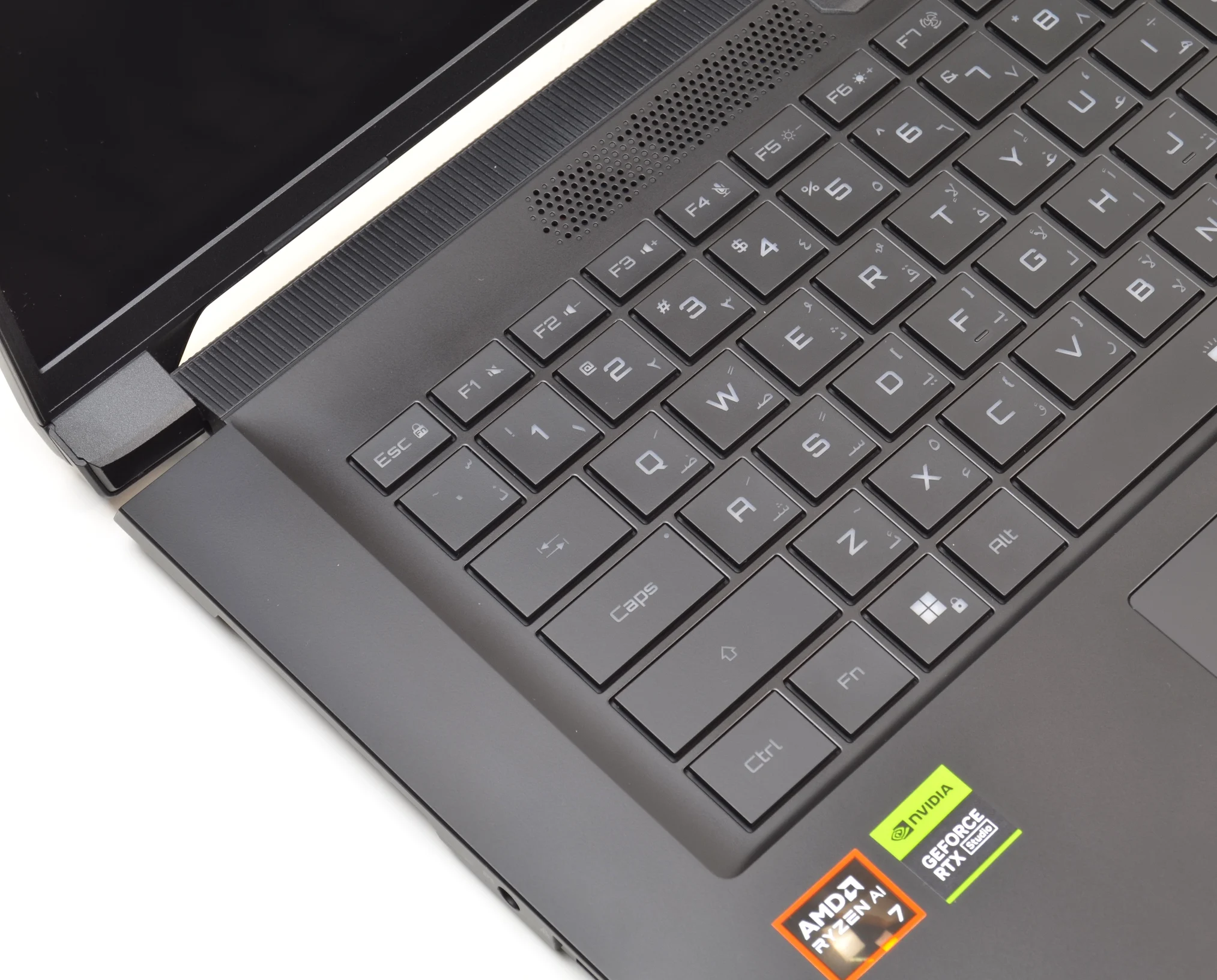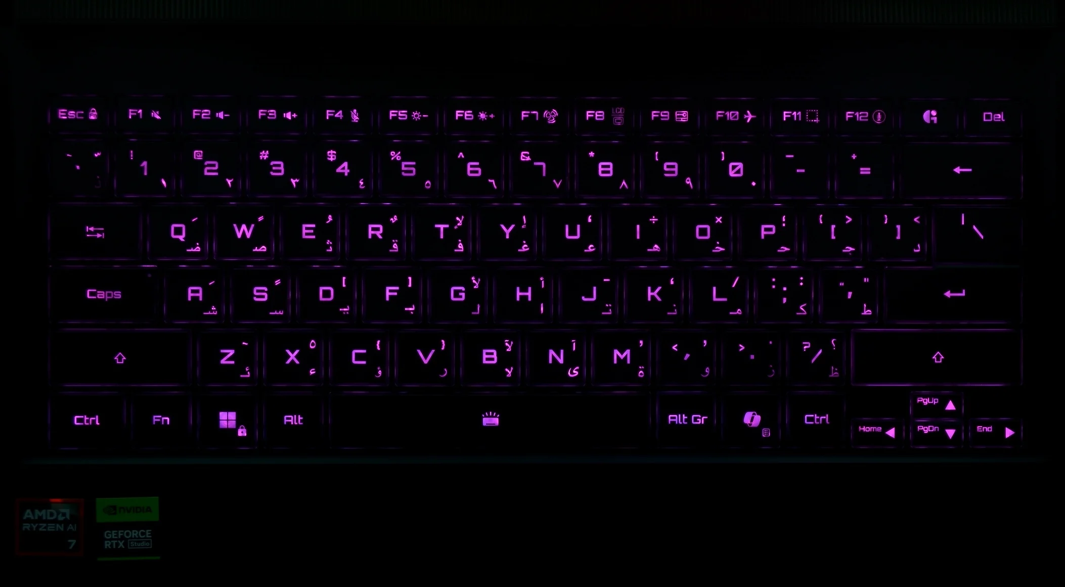 لوحة مفاتيح بدون النظام العددى مع وجود أحرف باللغة العربية ،  و ستجد شعار Microsoft Co-pilot للذكاء الأصطناعي ومساعد مايكروسوفت في نظام التشغيل ، حيث يعتبر هذا الجهاز من الأجهزة المدعومة رسميا مع قدرات المعالج في الذكاء الأصطناعى ، الكثير من المفاتيح فى الأعلى للوسائط المتعددة مثل ازرار تعلية الصوت و غلقة و تشغيل وضع الذكاء الأصطناعي من خلال برنامج GiMate و يوجد بعض الوظائف الأخرى التى يمكن تفعيلها عن طريق مفاتيح (FN+ المفتاح الذى تريدة) لتخصيص الإضاءة على سبيل المثال إضغط على زر المسافة وهكذا الوظائف الأخرى ، لوحة المفاتيح تدعم نظام إضاءة RGB للوحة ككل كمنطقة واحدة .