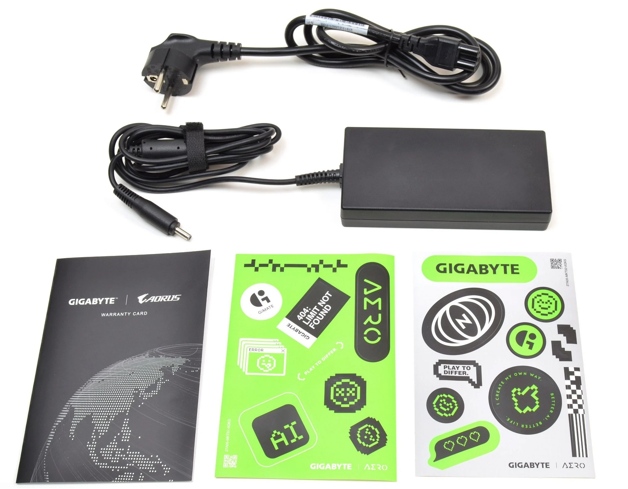 صندوق عريض بصورة واضحة و نحيف للغاية مصنوعغ من مواد صديقة للبيئة مع شعار AERO و GIGABYTE عليه بصورة واضحة و الشعار الجديد الذي تروج له الشركة وهو برنامج GiMate الذي يعتمد علي الذكاء الأصطناعي  ، ستجد مواصفات الوحدة الخاصة بنا في الجانب جهة اليسار حجم الصندوق قرابة 60 سم فقط للعرض ، لندخل إلى  المتعلقات التي تأتي مع الجهازالمتعلقات الخاصة بجهازنا اليوم بسيطة للغاية وهي الأساسية و تتمثل في :