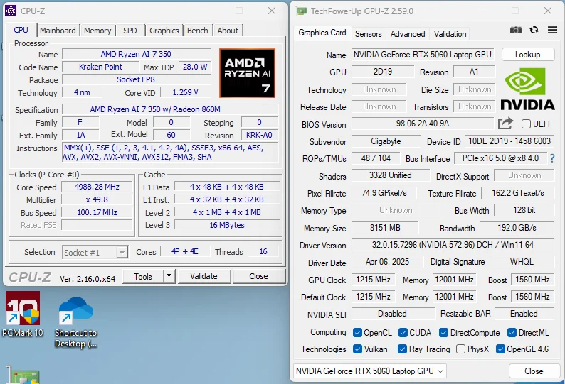 فى هذا الجزء سأشرح لك كيف يتفاعل البطاقة الرسومية و المعالج المركزى مع الألعاب والبرامج وهو جزء هام لتفهم الكثير المواصفات الخاصه بالبطاقة الرسومية المدمجة و حدود السحب الخاصة بها وهى 85 وات وتستخدم سرعة 8x من نوع PCI-E 4.0 وهو ما تقدمة معالجات AMD Ryzen Ai الجديدة في الحواسيب المحمولة حيث تملك تلك المعالجات معالج رسومي داخلي يتصل عن طريق 16x له مع المعالج المركزي ، بطاقة RTX 5060 هنا تمثل بالكاد بطاقة RTX 5060 من حيث القوة للحواسيب المكتبية ولكنها هنا محدودة الطاقة أيضا و حتي التردد منخفض بكل تأكيد ليناسب هذا الحواسيب المحمولة ، المعالج الخاص بنا وهو معالج Ai 7 350 وهو معالج من الفئة المتوسطة من حيث الأداء حيث يملك 4 انوية من نوع Zen 5 و 4 من Zen 5C المخفض ولذلك سيكون أداءة مختلفا عن المعالجات الأخري .