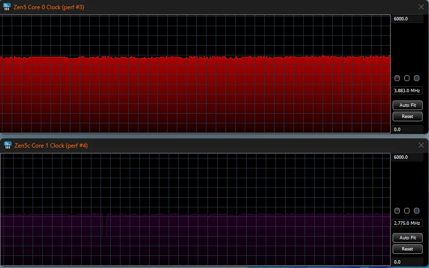 المعالج الخاص بنا يملك تردد متغير بكل تأكيد حسب الحرارة و سحب الطاقة و الاستخدام ولكن في جهازنا اليوم الحرارة لا تؤثر كثيرا حيث ان التبريد كافي و المعالج يملك مساحة كبيرة في الحرارة و التأثير هنا يكون من مكان أخر وهو ان المعالج يملك نوعين من الأنوية فأنوية Zen5 يمكنها الوصول لترددات أعلي من انوية Zen 5C ولذلك سيكون التردد مختلف فكما تري يمكن للأنوية وقت الضغط العنيف للمعالج ان تصل إلي 3.9GHz تقريبا في المتوسط و 2.8GHz لانوية Zen 5C ولا تنسي ان بأستطاعة المعالج الخاص بنا اليوم ان يصل إلي تردد 5.1GHz للنواة الواحدة في حالات الاستخدام الخفيفة .