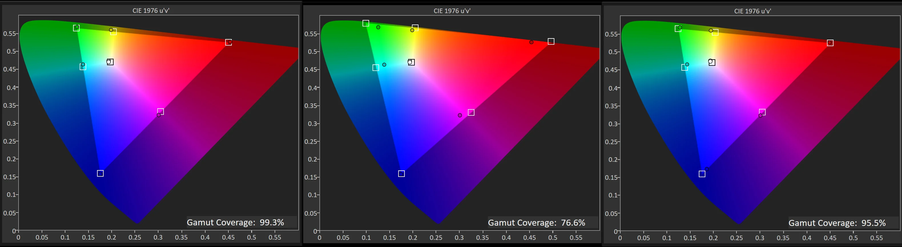 يتم قياس مدى تغطية الشاشة لمعاير الألوان المختلفة وهو ما سنراه في الجدول في الأسفل