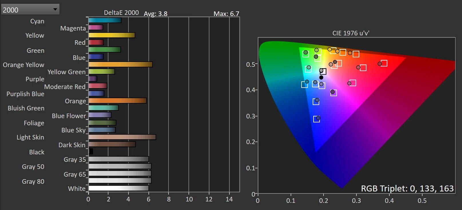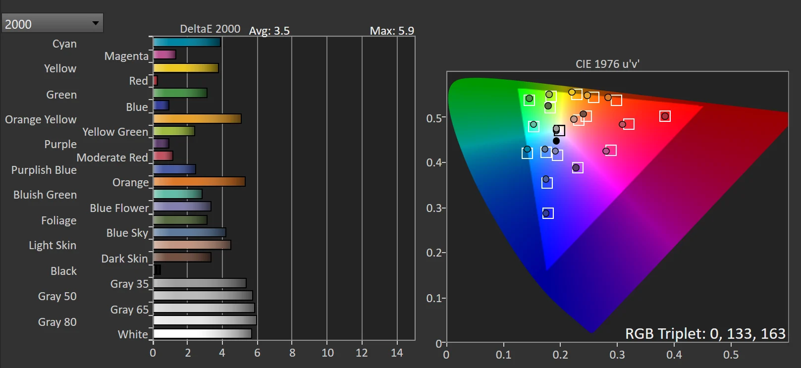 Items | Color dE (<1) | White balance dE (<1) | Gamma (2.2) | Color Temp (6500K) | Contrast | Brightness |