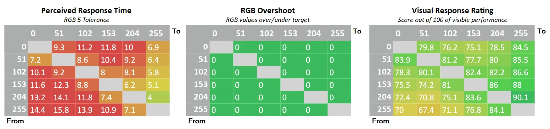 Items | Avg GTG | Best Response | Average Perceived | Worst complete time | Input Lag | Avg RGB Overshoot error |