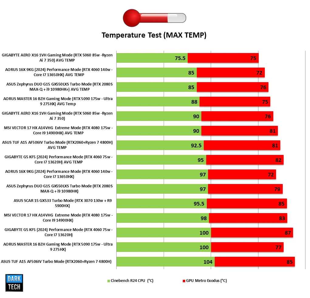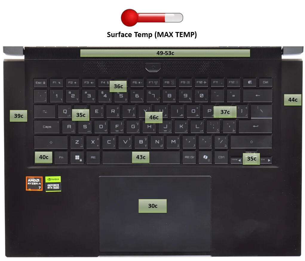 تجربة المستخدم بكل تأكيد تتأثر بسطح الجهاز و حرارته وهناك العديد من الأجهزة القوية ولكنها يكون لها خرج حرارى علي لوحة المفاتيح بصورة قوية مما يجعل تجربة المستخدم ليست الأفضل ، في جهازنا اليوم أقصي حرارة يمكن ان تشعر بها هي 46 درجة عند زرار Y وتقل تدريجيا حسب باقي المناطق وهو ما يقدم تجربة ممتازة للمستخدم حيث ان الحرارة علي سطح الجهاز منخفضة للغاية مع التشغيل لوقت طويل وهو ما يعكس تجربة مريحة للمستخدم بكل تأكيد ،أيضا هذا الأختبار كان مع أستخدام الشاحن وليس البطارية للحصول علي أعلي سحب طاقة و حرارة من الجهاز و في درجة حرارة الغرفة 24 درجة و استخدام وضع Game Mode .
