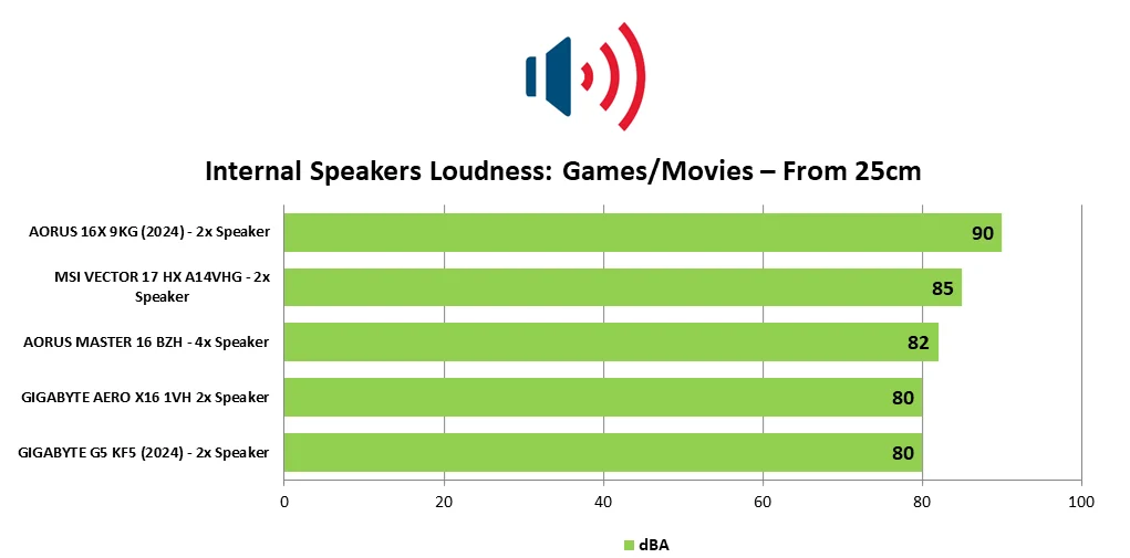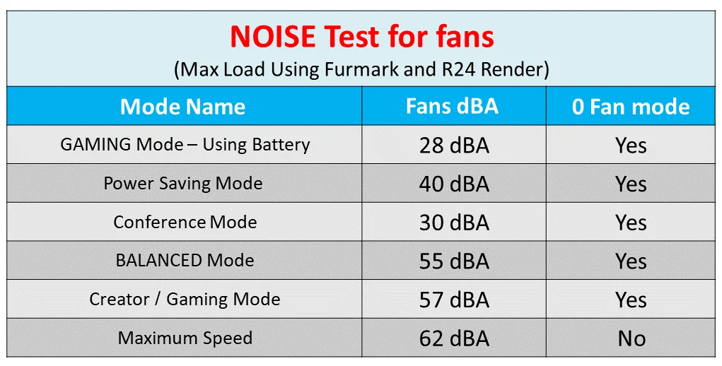 النتائج التي حصلنا عليها توضح ان الجهاز لا يقدم ازعاج يذكر علي وضع البطارية وهو النتيجة الممتازة هنا كذلك وضع Conferance Mode مع استخدام الشاحن ممتاز ، اما علي الأوضاع الأخري لسرعة المراوح فهذه أقصي معدلات أزعاج تحصل عليها ، أيضا الأزعاج علي أقصي معدل دوران للمراوح هو 62 ديسيبل وهو رقم كبير ولكنة يظل منخفض مقارنة ببعض التبريدات التي أختبرناها مؤخرا خاصة ان المراوح لا يسمعها المستخدم بصورة مباشرة في جهازنا اليوم يجب ان تنتظر دقيقتين ليبدأ الجهاز في إصدار صوت قوي بفضل المعالج المركزي و التبريد و سحب الطاقة المنخفض بكل تأكيد ، أيضا هذا يعني ان المستخدم سيلاحظ الأزعاج في حالات اللعب القوي حيث ان البطاقة الرسومية هي الأكثر إزعاجا في جهازنا اليوم و ان هذا الأزعاج سيمثل 70% من صوت سماعات الجهاز لذلك سيحتاج المستخدم أحيانا إلي استخدام سماعات للألعاب للحصول علي تجربة أفضل بكل تأكيد او ضبط المراوح من خلال الوضع الأحترافي من البرنامج الملحق لتناسب تجربتة و بشكل عام الجهاز يعتبر معظم الوقت هاديء.