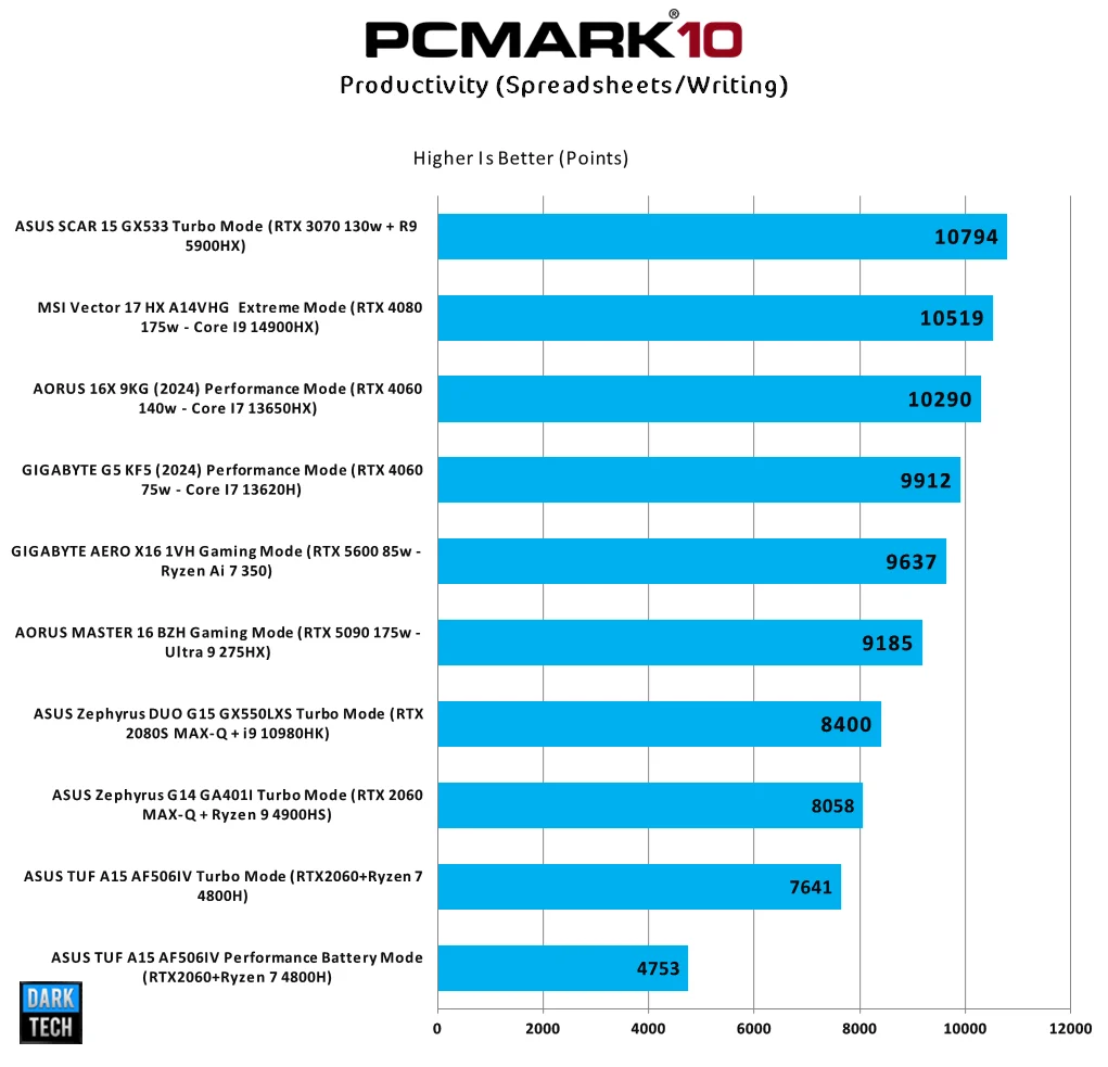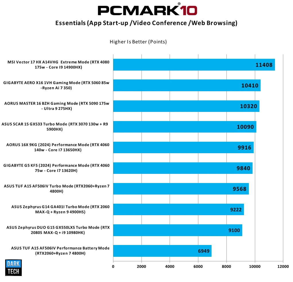 هذا الأختبار يتم فيه قياس سرعة فتح البرامج و القيام بعمليات التصفح و الاجتماعات عبر الفيديو و بالطبع تتسائل لماذا يمكن ان يعطي الجهاز الخاص بنا هذه النتيجة ؟ بفضل ثباتة علي ترددات مرتفعة بكل تأكيد للمعالج المركزي ولعدد انوية كبير و ايضا زمن وصول أفضل لهذه المعالجات من AMD مقارنة بغيرها
