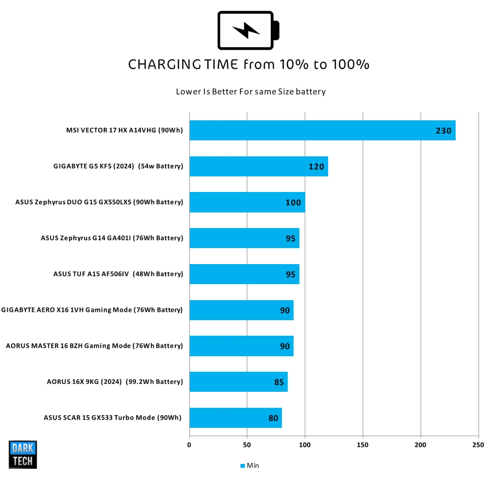 رغم ان البطارية 76wh ولكن الجهاز يحتاج إلي 90 دقيقة للشحن بشكل كامل وهو رقم جيد بكل تأكيد بكل تأكيد مقارنة ببعض الأجهزة الأخري ولكن البطارية تشحن 50% من قدرتها في أول نصف ساعة فقط وهو امر ممتاز و 98% في ساعة فقط .