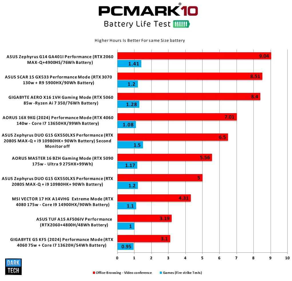 الجهاز الخاص بنا يمكنة ان يصمد فى الأستخدام اليومى قرابة 8 ساعات و 40 دقيقة وهو رقم ممتاز لا يمكنك الحصول عليه من أجهزة تعمل بمعالج Intel بسهولة مع بطارية 76Wh تماما وهو ما يعني قدرة معالجات AMD علي توفير ممتاز للطاقة للإستخدام الفعلي مع المستخدم ، أيضا حجم الشاشة 16 بوصة مع هذا الجهاز وهو ما يضع حمل علي البطارية في سحب الطاقة ، يجب ان تعرف ان شركة GIGABYTE تجعل الجهاز يقوم بغلق البطاقة الرسومية الخارجية علي البطارية او يمكنك تفعيلها إذا اردت وفي أختبارنا اليوم قمت بتفعيلها بكل تأكيد ، ايضاً اقصي مده للعب علي الجهاز هى 88 دقيقة علي وضع Gaming و قمت بتفعيل البطاقة الرسومية الخارجية في هذا الأختبار وهو رقم جيد جدا علي حجم البطارية اليوم ولكن يجب ان تعرف ان الجهاز يقوم بالإنتقال إلي وضع توفير الطاقة عند وصول البطارية إلي 20% من قيمتها ، بكل تأكيد علي البطارية الخاصة بنا اليوم بحجم 76.1Wh ولا تنسي ان احد مميزات المعالج الخاص بنا اليوم انه يمكنك ان تلعب عليه الكثير من الألعاب علي إعدادات متواضعة دون تشغيل البطاقة الخارجية وهو ما سيقدم لك عمر أكبر بكثير في حالة إستخدامها