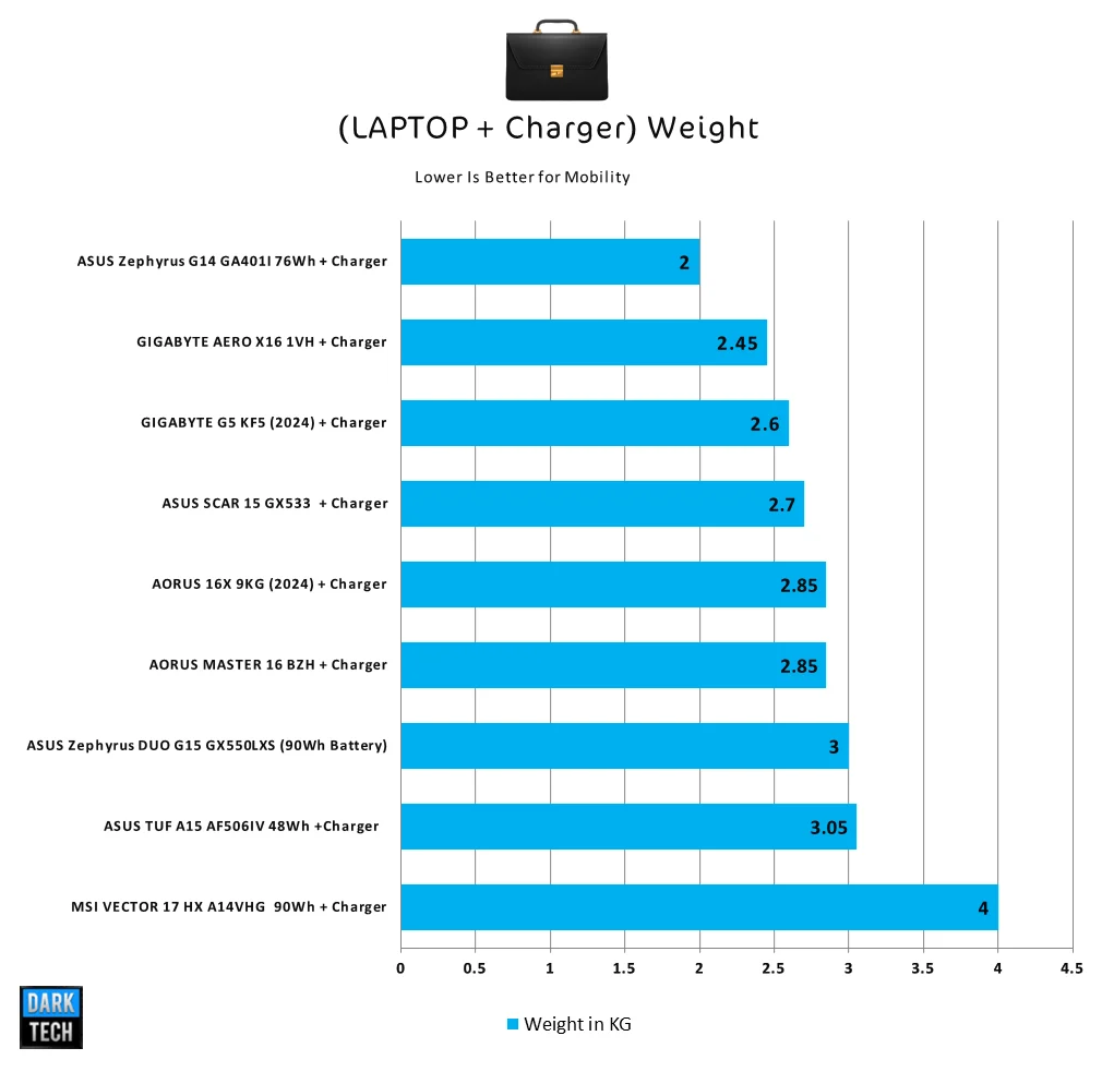 سهولة التنقل يؤثر فيها ليس ارتفاع الحاسب المحمول او حجمة فقط إنما من وجهة نظرى هو وزن الجهاز والشاحن الخاص به فكلما زاد الوزن سيعتبر هذا حمل زائد عليك لمحبى التنقل الكثير بتلك الأجهزة ، الأختبار هنا بشاحن ال 150 وات سيكون الوزن هو 2.45KG مما سيجعلة يملك وزن جيد علي هذا العتاد مع تصميم نحيف للغاية.