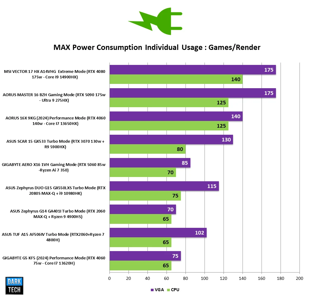 – – 85 وات للمعالج الرسومي RTX 5060 تجعل البطاقة محدودة بعض الشيء رغم تفوقها التقني و كان يمكن تقديم سحب أعلي من هذا من خلال توفير شاحن أعلي مع الجهاز أكبر من 150 وات