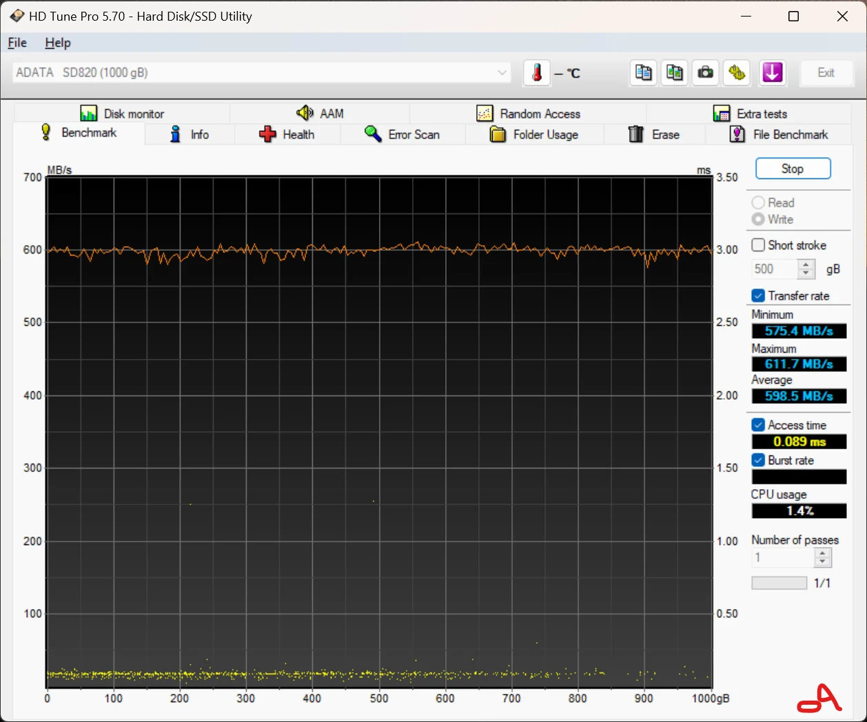 معدل الكتابة هو 598.5MB/S وهو جيد جدا و مع الكتابة الكثيفة تجد ان الوحدة لا تنخفض في الكتابة وهو امر ممتاز في هذا الصدد