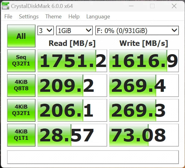 معدلات 1751MB/s للقراءة و معدلات الكتابة 1617 ، وهى معدلات جيدة جدا ولكنها ليست الأفضل مقارنة ببعض الوحدات المنافسة