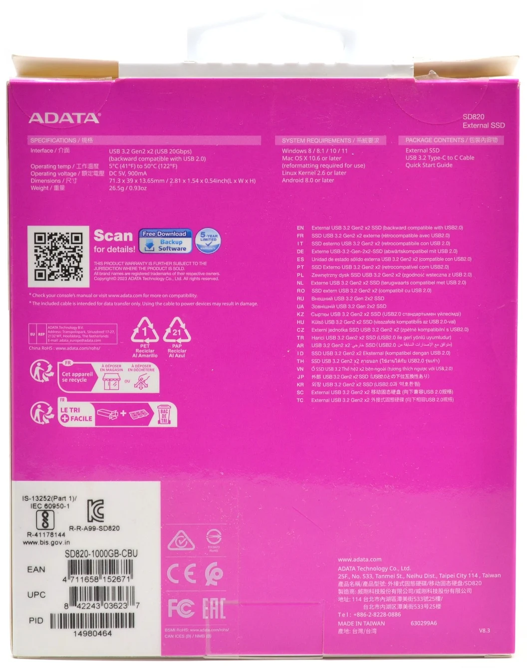 اليوم لدينا أحد أحد حلول التخزين الجديدة التي تقدم الاعتمادية من خلال معيار Ip68 لمقاومة الماء و الأتربة مع معيار عسكري لمقاومة الصدمات من ارتفاع 1.2 متر ، وحدة SD820 من ADATA فهي خليفة إصدار SD810 ولكن بوزن أقل بكثير 26.5 جرام مع حجم صغير لها أيضا ، الوحدة الخارجية من نوع SSD او تأتي بأحجام 1TB حتي 4TB مما يوفر الكثير من الإصدارات لكل مستخدم ، الوحدة تعمل عبر منفذ USB 3.2 Gen 2X2 بوجهته المعروفة Type-C و بسرعة تصل إلى 2000MB/s للقراءة و الكتابه يبلغ سعر وحدة 1TB التي لدينا اليوم قرابة 85 دولار ، قبل ان نبدأ مراجعتنا عن وحدة التخزين لندخل إلى نظرة بسيطة على المواصفات الخاصة بوحدتنا