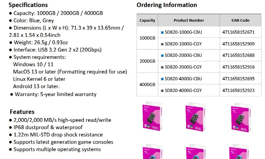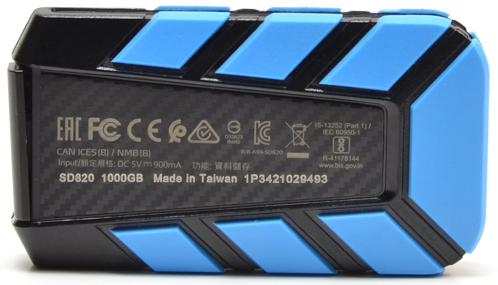 وحدة SD820 هي وحدة أخري بديلة لوحدة SD810 ولكن مع وزن أقل للنصف و تغليف من البلاستيك للوحدة و لكن في المجمل الوحدة تمثل احد أصغر وحدات SSD الخارجية التي يمكن الحصول عليها مع معياار IP68 لمقاومة الماء و الأتربة و معيار مقاومة الصدمات من ارتفاع 1.22 متر ، الوحدة تزن 26.5 جرام فقط مما يجعلها أحد أفضل الحلول المتاحة للتنقل و التخزين و التشغيل حتي مباشرة منها للألعاب والأفلام وحتي صناعة المحتوى دون أي مشكلة اقصي حرارة كانت60 درجة مما يجعل المتحكم يعمل بكامل سرعتة دون مشكلة تماما في الأستخدامات التقليدية