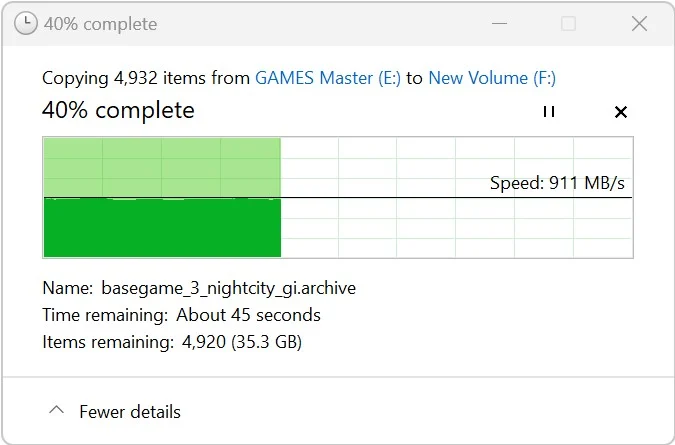 قم بنقل ملف واحد كبير بحجم 65 جيجا وكانت السرعة شبة ثابتة علي 911MB/s وهي سرعة جيدة جدا علي وحدة التخزين الخارجية بالطبع هذه السرعة بعد النقل أكثر من مرة لنجعل الوحدة تنتج حرارة اكبر و تقل معدل الكتبة