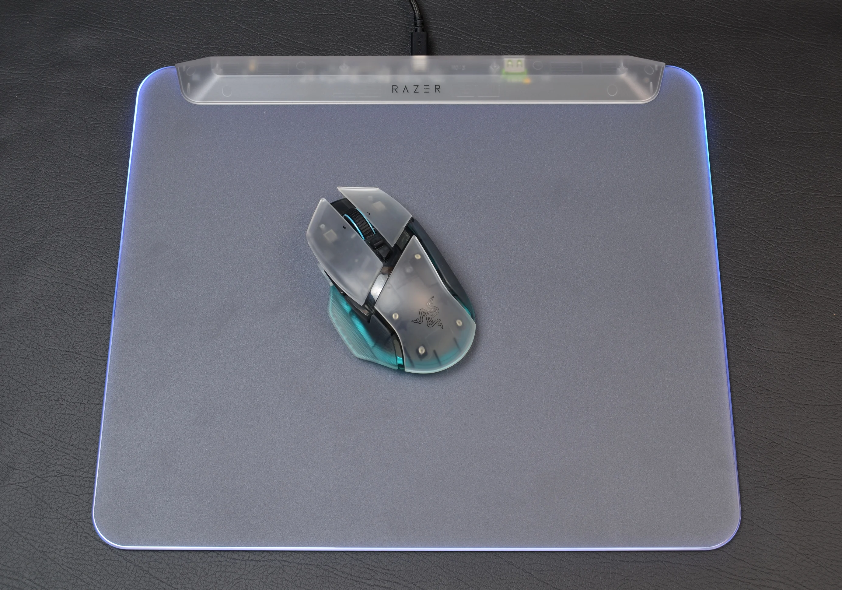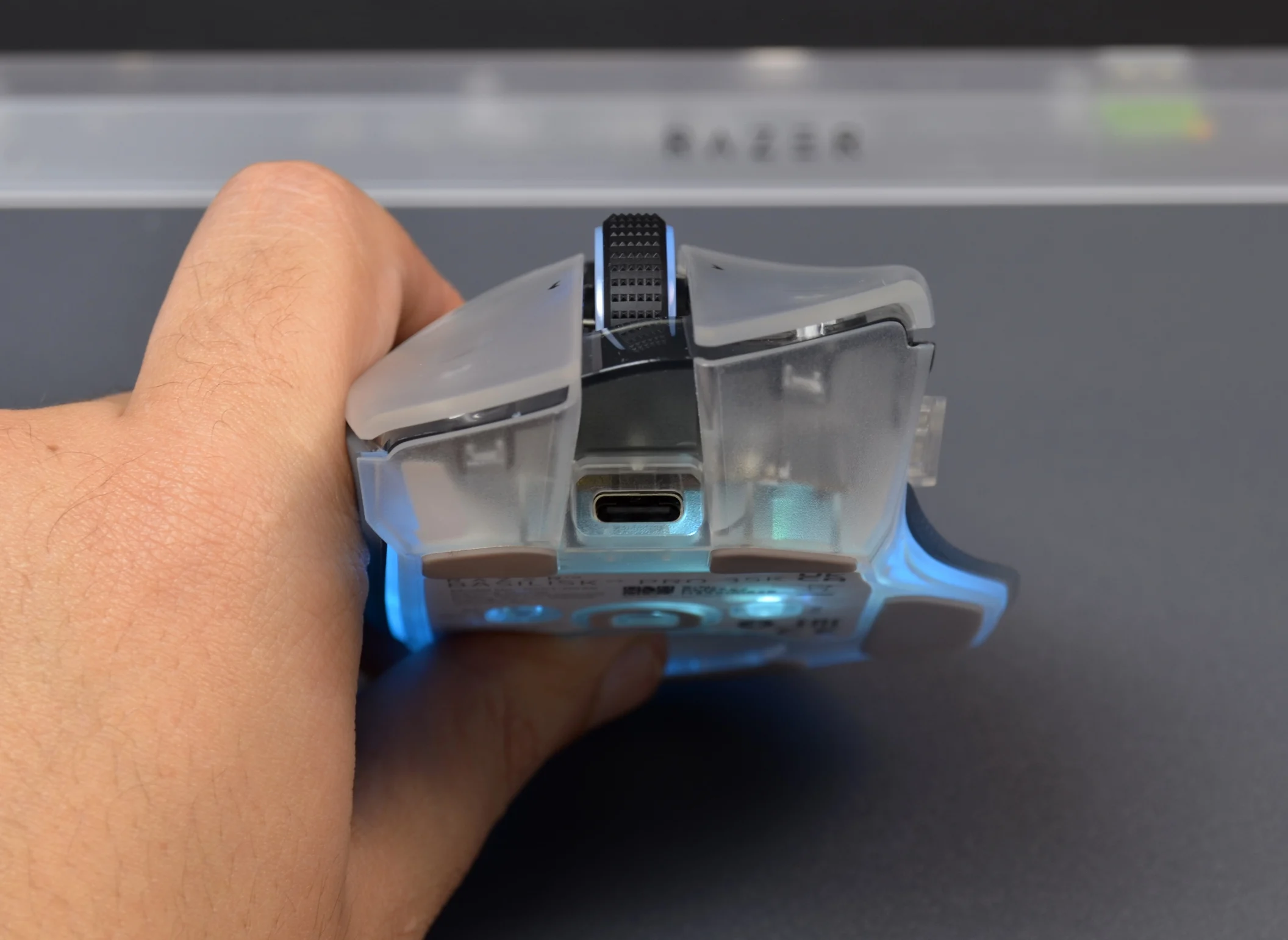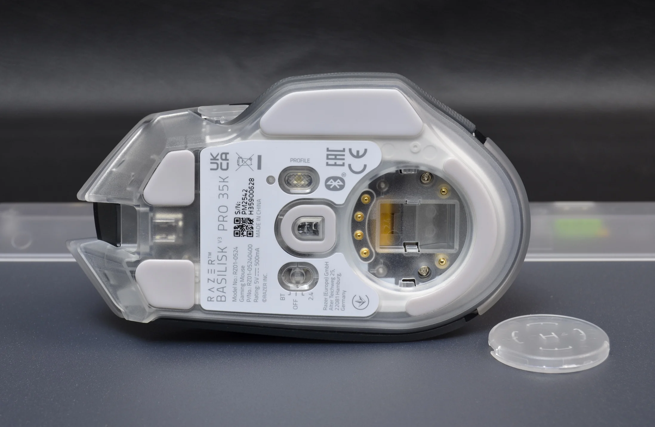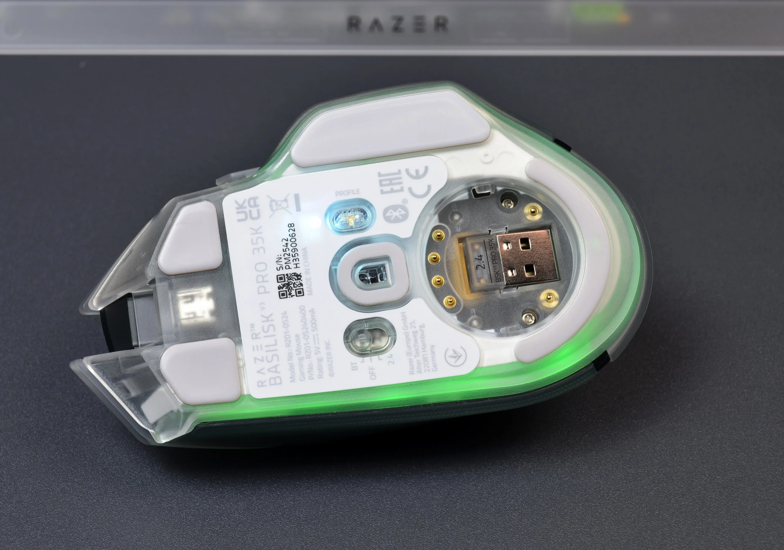 فى اسفل الماوس ستجد زر لتشغيل الماوس عبر طرق التوصيل اللاسلكية المختلفة أيضا يوجد زر خاص بتغير الأوضاع المخصصة علي ذاكرة الماوس والتي يقوم بحفظها المستخدم فيه من خلال البرنامج الملحق  و بالتأكيد يأتي مع الماوس الجزء الدائري الذي يمكنة من الشحن  من ملحقات الشركة المختلفة ولكن قمت بنزع هذا الجزء حيث ستجد مكان يمكنك حفظ فيه وحدة الإتصال من نوع wifi 2.4GHz في جسم الماوس نفسة في حالة التنقل ، البطارية الخاصة بالماوس يمكنها العمل حتى 210 ساعة من خلال إتصال البلوتوث او 140 ساعة مع معدل تحديث 1000Hz بصور ثابتة او 28 ساعة مع معدل تحديث 8000Hz و بالطبع يقدم البرنامج الخاص بالشركة ميزة للمستخدمين
