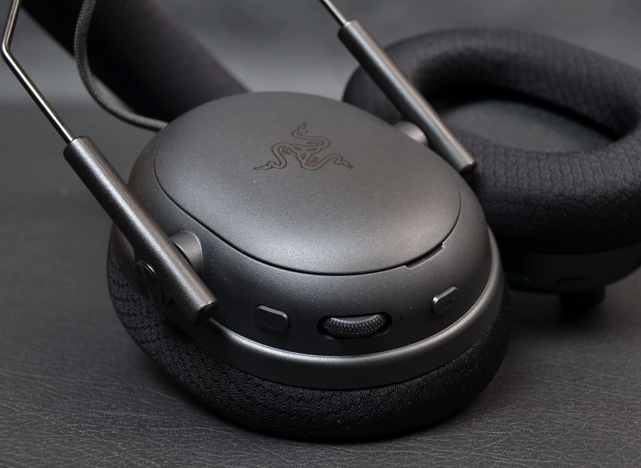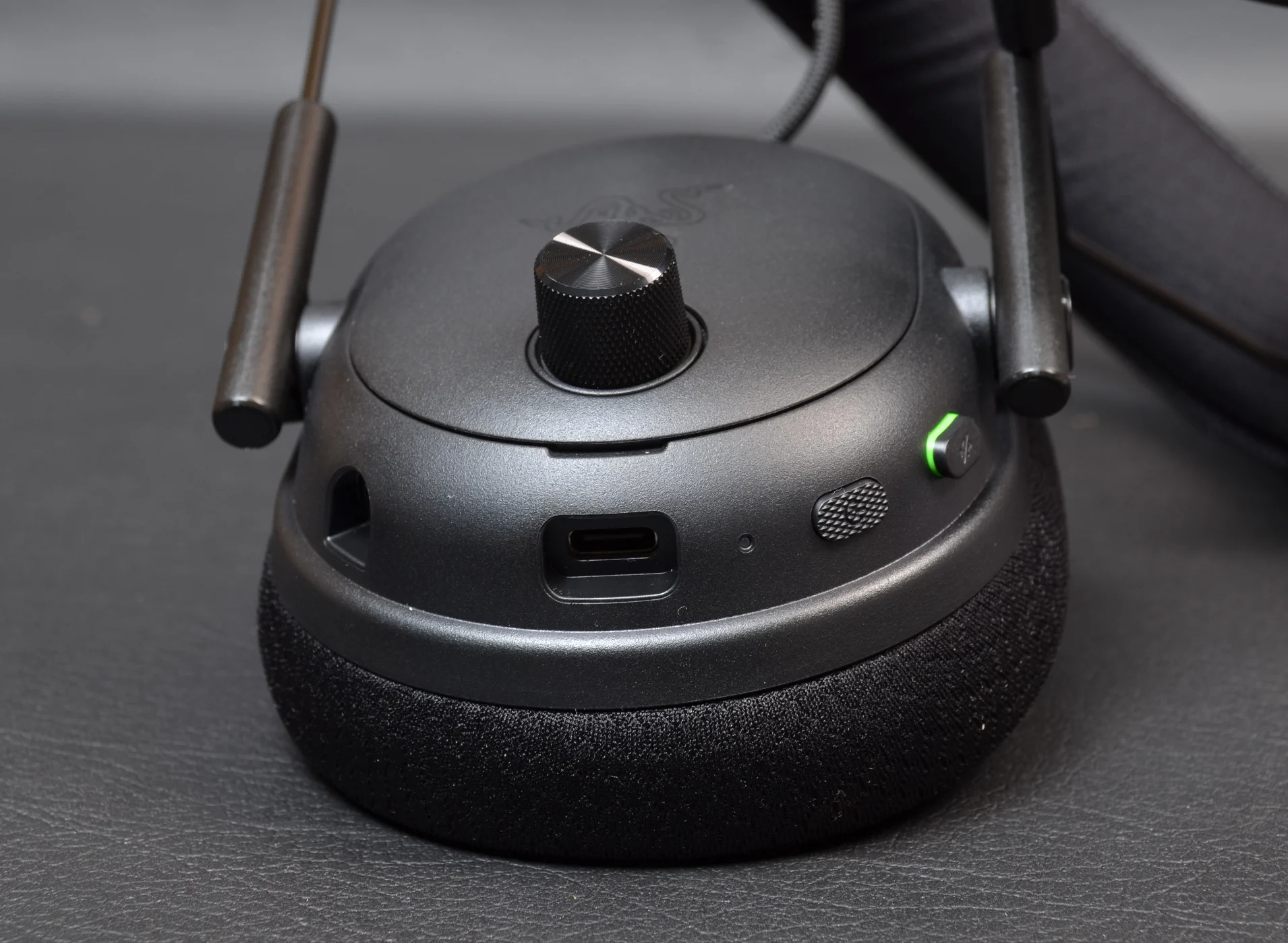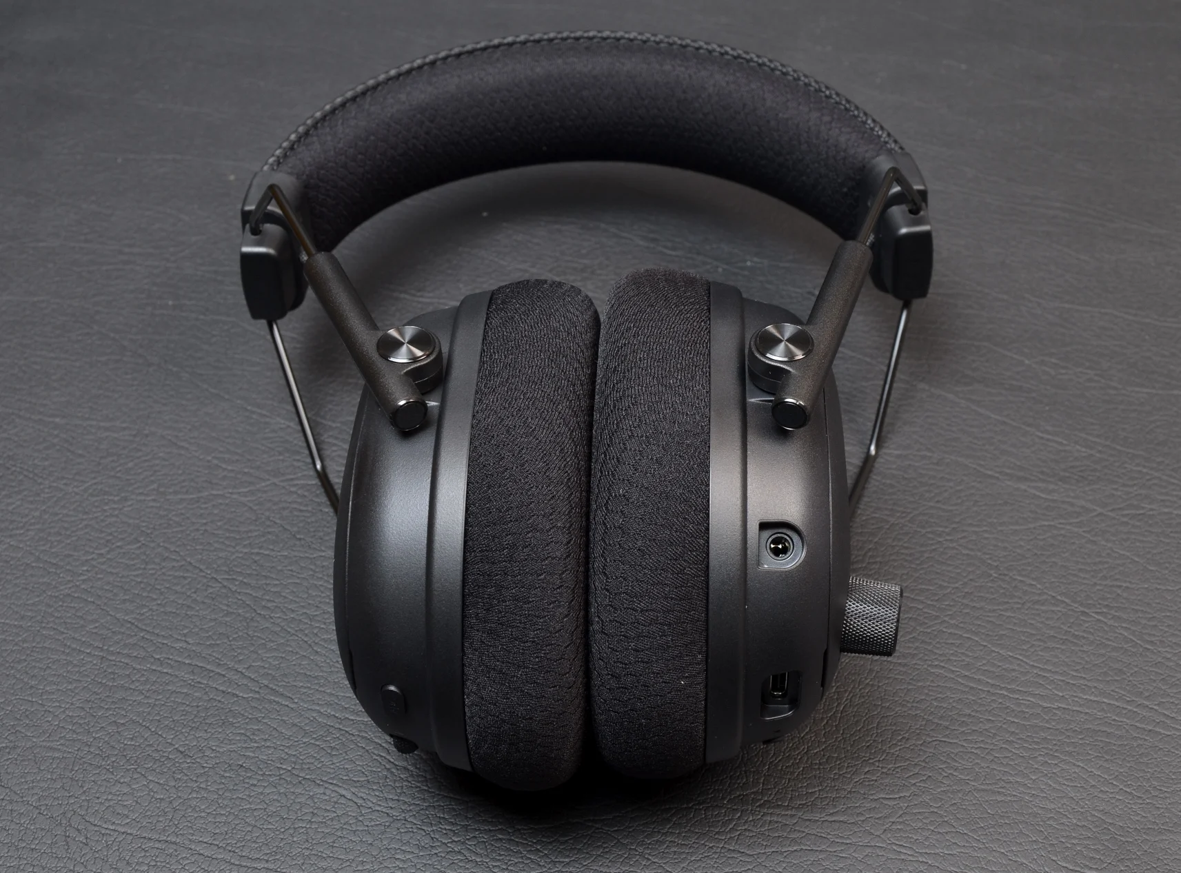 تقنية ANC يتم تفعيلها من هنا بأكثر من ضغطة لكل مستوي  ،في المنتصف ستجد جزء دائري متحرك يمكن المستخدم من زيادة صوت بعض البرامج مثل Discord ولكن لنا تعقيب عليه في نهاية المراجعة ،  أيضا الزر الذي يملك سهمين هو المسؤل عن التنقل بين تقنيات التوصيل التي تملكها السماعة وهي BT و Wifi للتنقل بين الهاتف مثلا و الجهاز الكمبيوتر الخاص بك بل و مع ضغطة بسيطة يقوم بتغيير اوضاع الصوت المضبوطة في السماعة دون الحاجة إلي السوفت وير الخارجي.