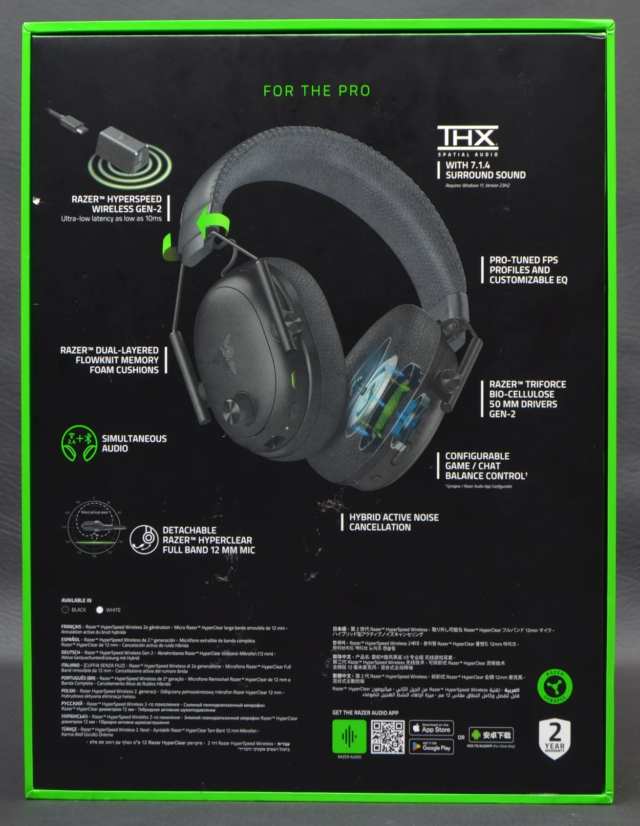 فى الخلف ستجد توضيح لمميزات السماعة  و المواصفات الخاصه بمحركات الصوت الثلاثية حيث تتكون تلك المحركات من ثلاثة اجزاء مختلفة لتقديم الصوت الخاصة بسماعاتنا اليوم وهذا تصميم خاص بشركة Razer و حصرى لها ،  و وزن السماعة وهو 376 جرام مما يعني الوزن المتوسط المناسب للتنقل و الإستخدام لفترات الطويلة في الألعاب