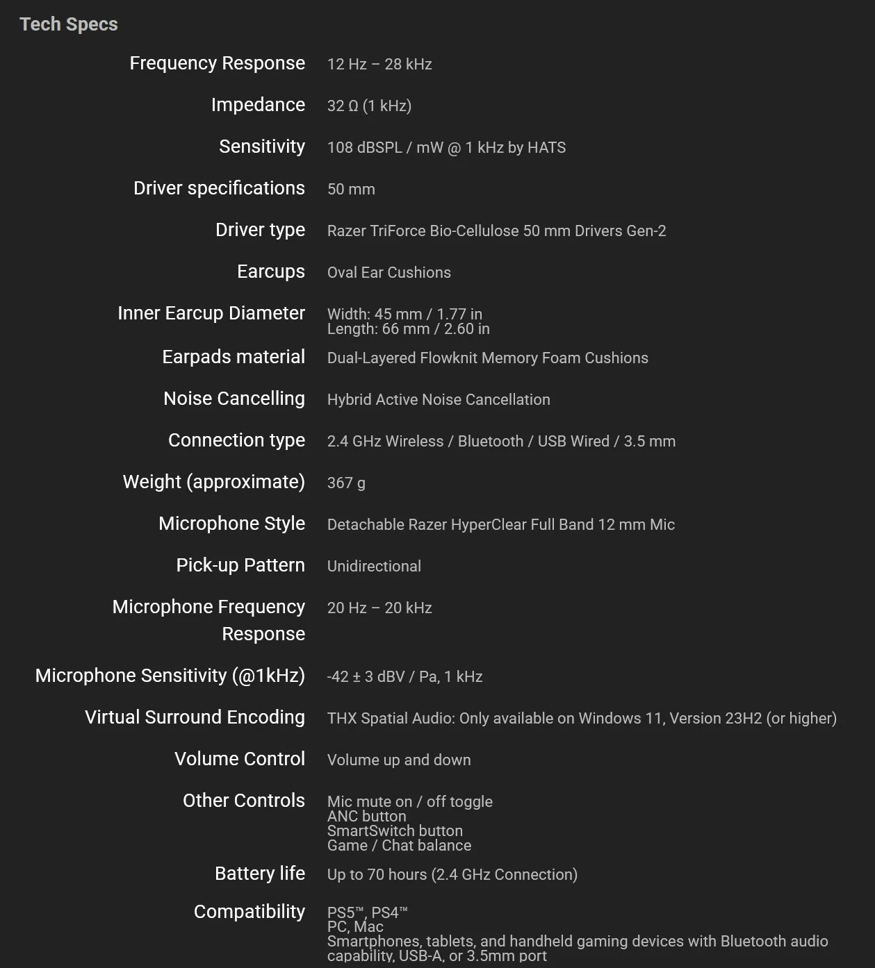 لدينا اليوم أحد أشهر السماعات الموجهة للاعبين بصورة أساسية و المعروفة بجودة الميكرفون الخاصة بها مع زمن إستجابة ممتاز كسماعة لاسلكية مع إمكانيات لا نهائية مثل عزل الضوضاء الهجين بتقنيات ANC و إمكانية إستقبال المكالمات أثناء اللعب دون اي مشكلة و بطارية تدوم 70 ساعة ! مع طرق توصيل كثير نبدئها من  BT و Wifi و Type-C و 3.5mm إنها سماعة BLACKSHARK V3 PRO التي تأتي موجهة للاعبين بصورة أساسية ، أيضا السماعة تدعم كافة المنصات تقريبا بداية من الهواتف الذكية حتي منصات الترفية المنزلي المختلفة ، السماعة تأتي بوزن 367 جرام مما يجعلها جيدة جدا في الأستخدام للتنقل و راحة الأرتداء لساعات طويلة ، السماعة تأتي بسعر 250 دولار وهو بالطبع سعر نسبيا مرتفع كعادة منتجات Razer فهي تريد المستخدمين من الفئة الإحترافية و تقدم لهم ما يريدون و هذه هي المواصفات الخاصة بها