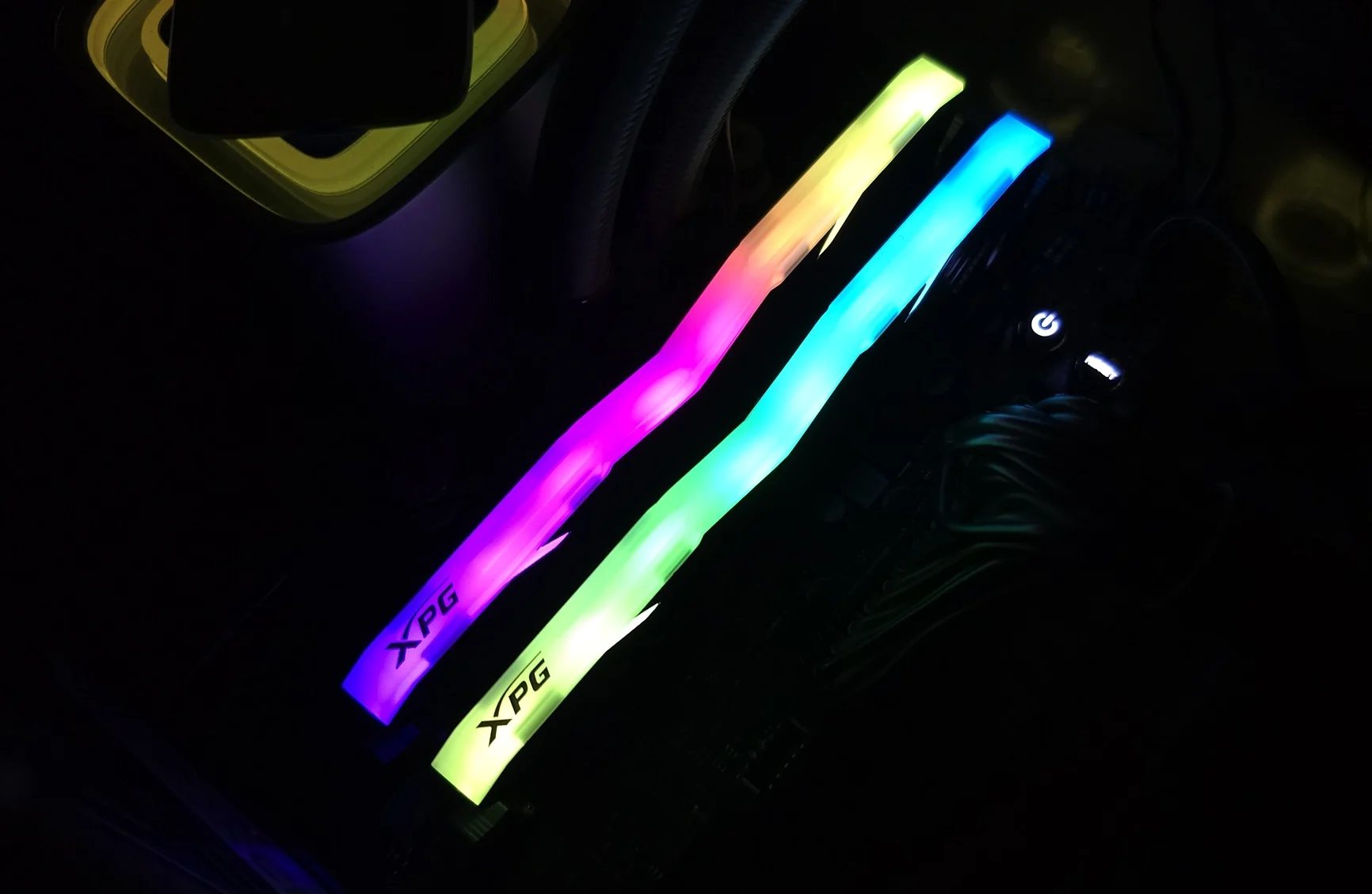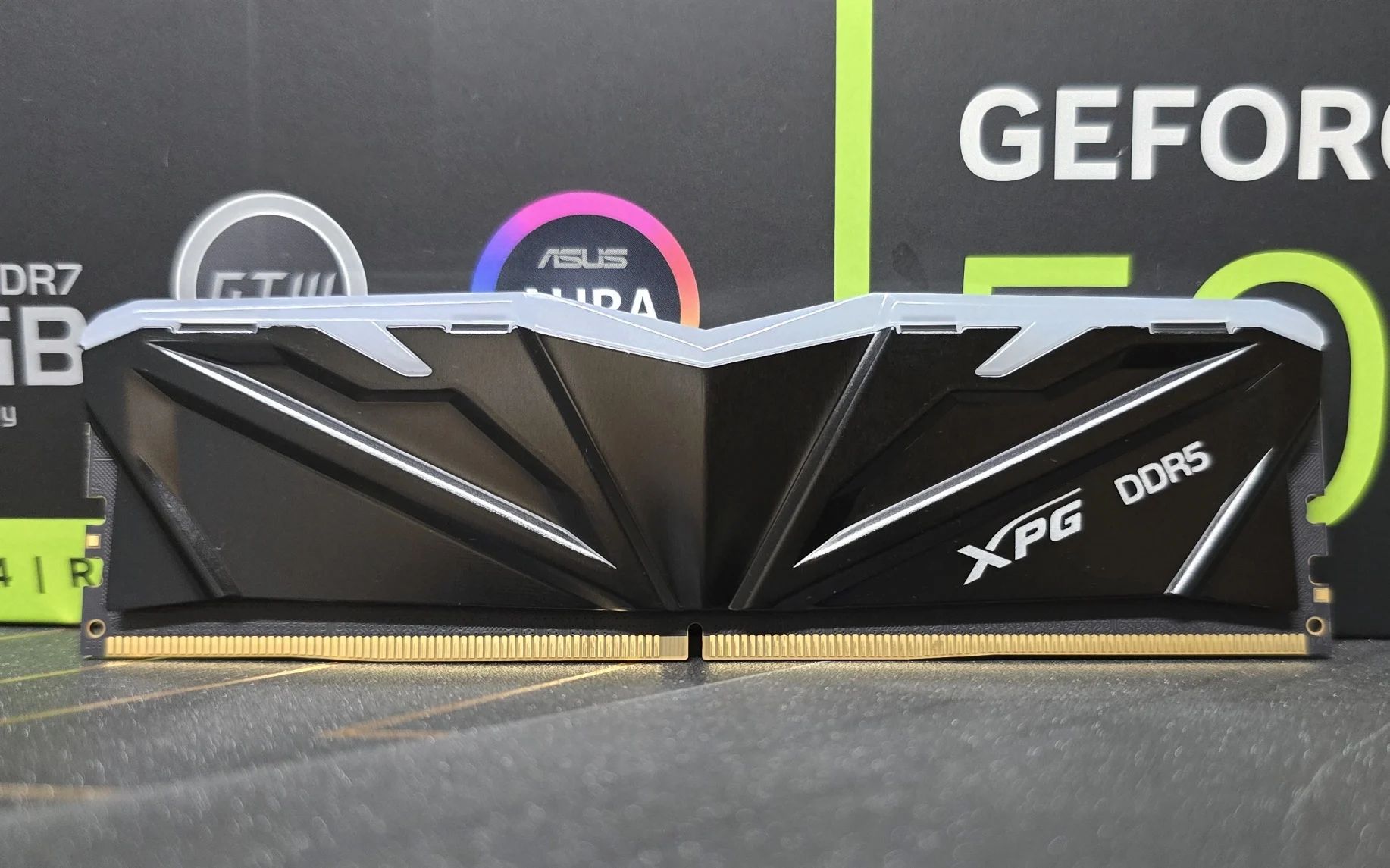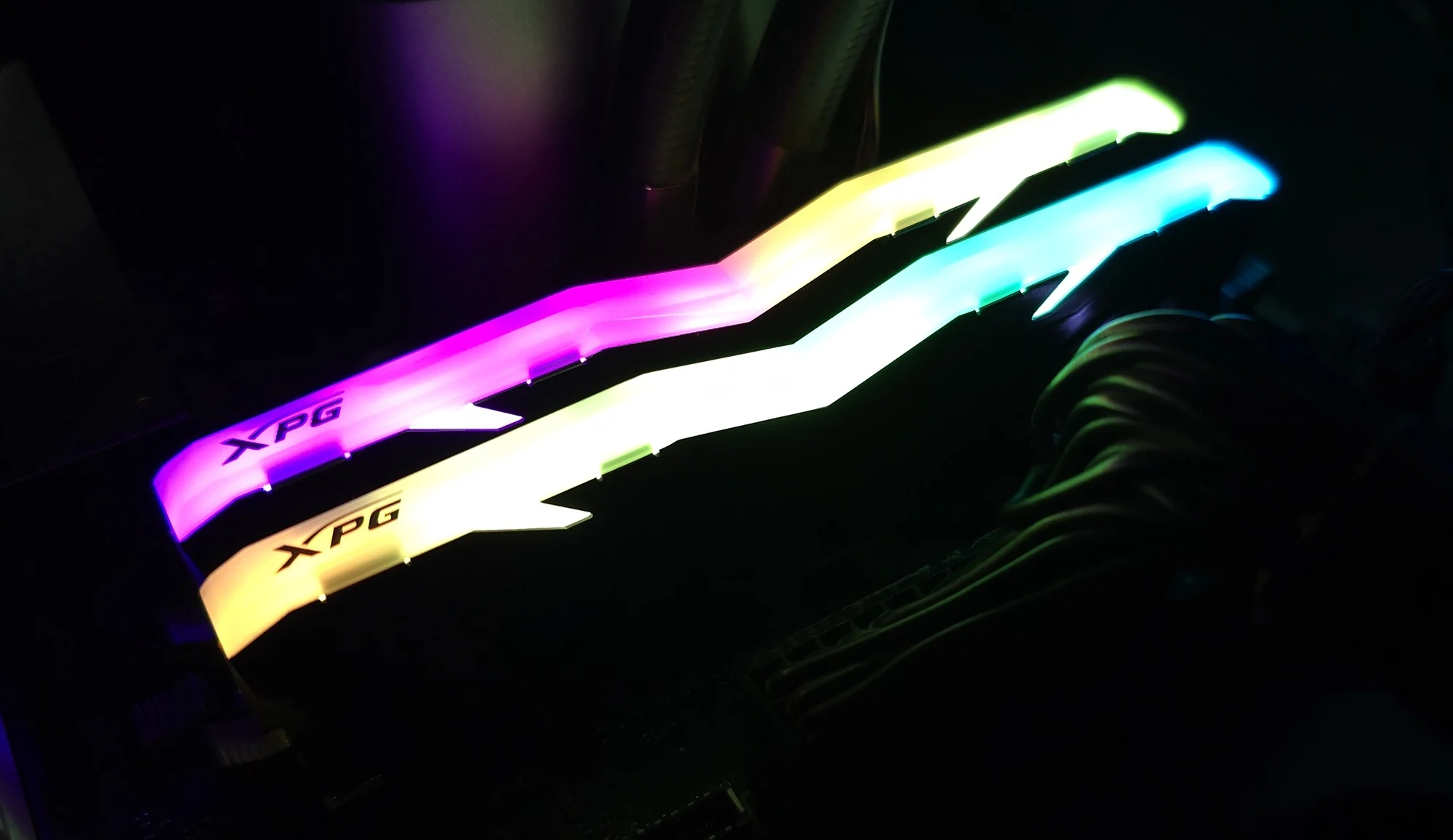 الذواكر حتي بدون إضاءة تملك تصميم فريد من حيث الشكل الخارجي و مميز ، التبريد الخاص بالذواكر من الألومنيوم لتبريد الذواكر من الجوانب ، ، الإضاءة الخاصة بالذواكر تكون من أعلي مع شعار XPG و سنتعرف عليه لاحقا ، الذواكر الخاصة بنا من شركة Hynix