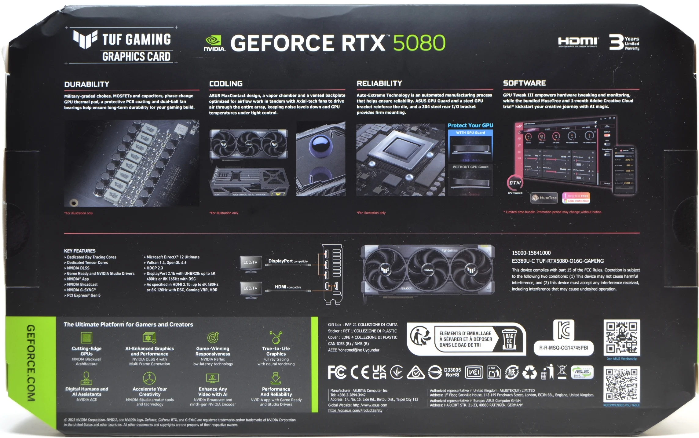 الصندوق يوجد علية العديد من الشعارات منهم شعارات تقنيات NVIDIA و شعار ان البطاقة هي نسخة OC Edition في الأسفل جهة اليسار ، التبريد بحجم ضخم للغاية و أداء ممتاز كما سنري معا ، البطاقة تأتي بثلاثة مراوح بحجم 110 مم تقريبا+