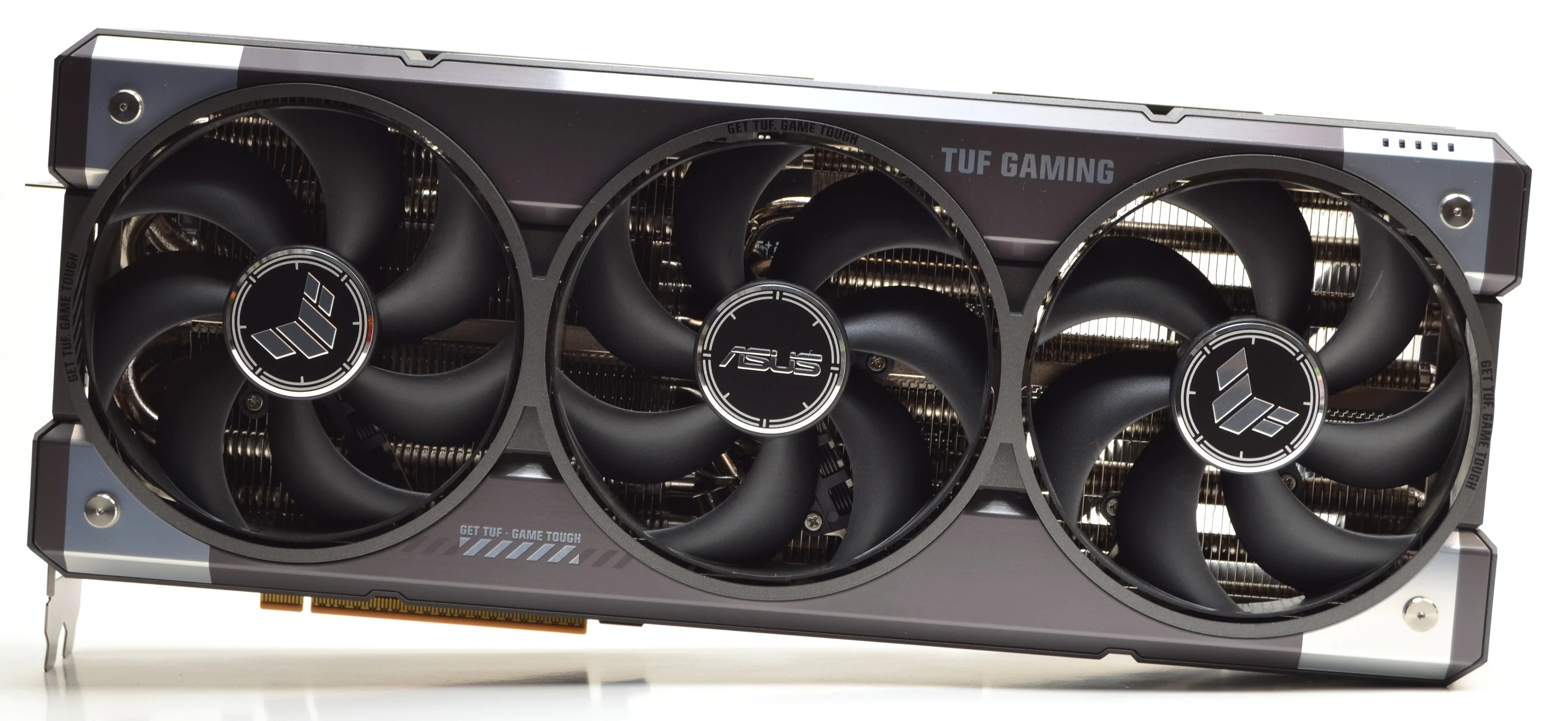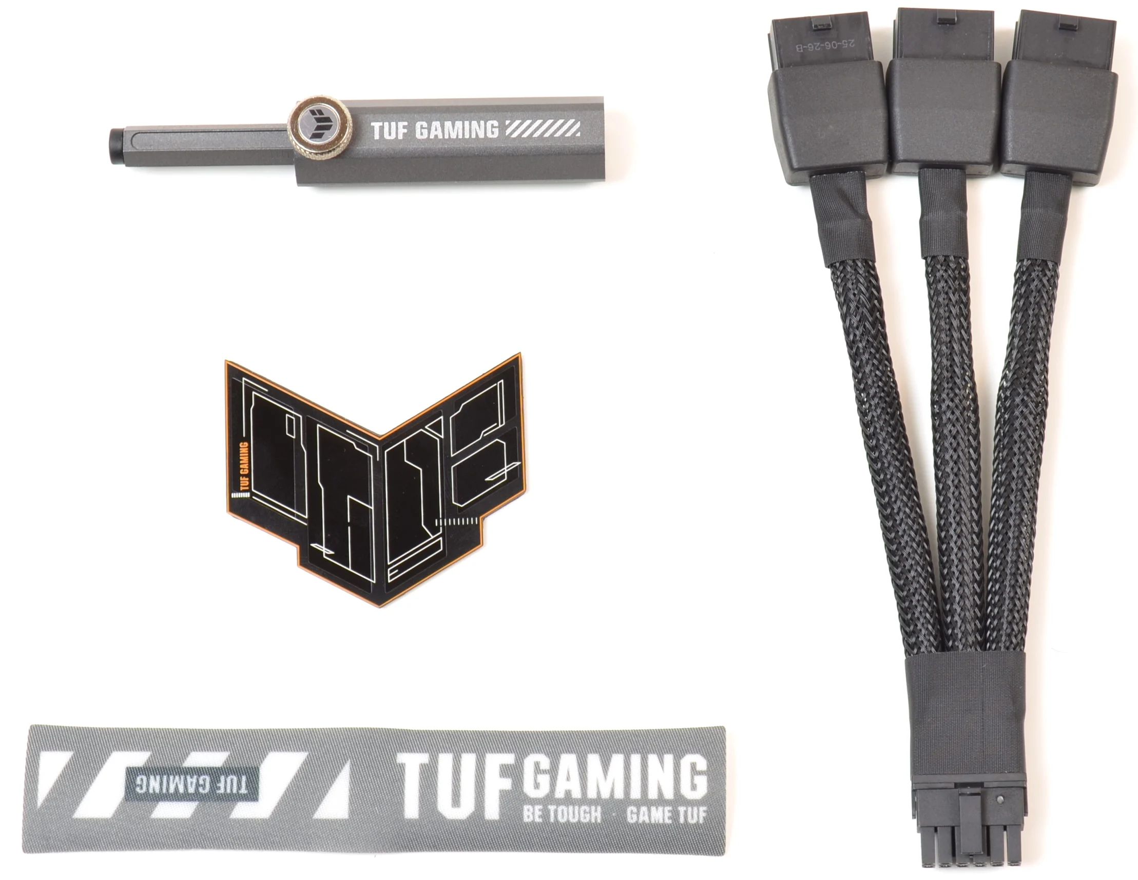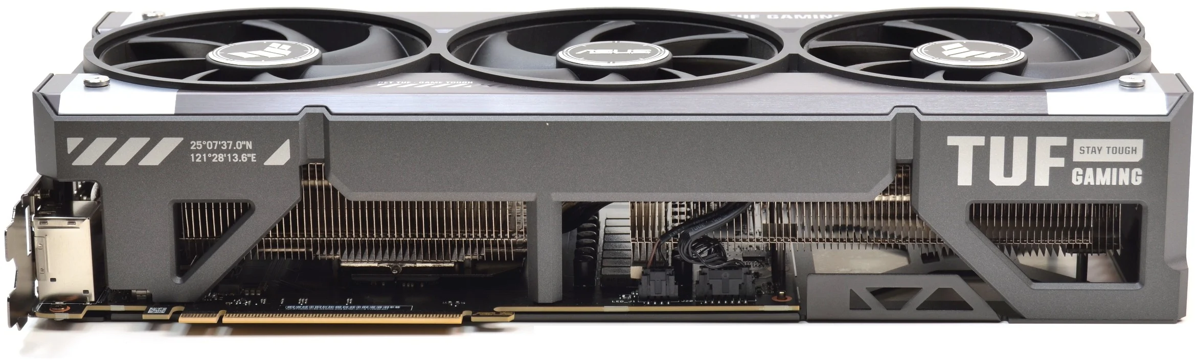 فى الأعلى شعار TUF وهو مضيء بإضاءة من نوع ARGB و يمكن التحكم به من خلال البرنامج الملحق ، ارتفاع البطاقة أو سمكها 7 سم اي ان البطاقة ضخمة ، البطاقة تملك وزن 1880 جرام تقريبا وهو ما يعني ان البطاقة وزنها ثقيل و يجب استخدام الأداة الملحقة معها !