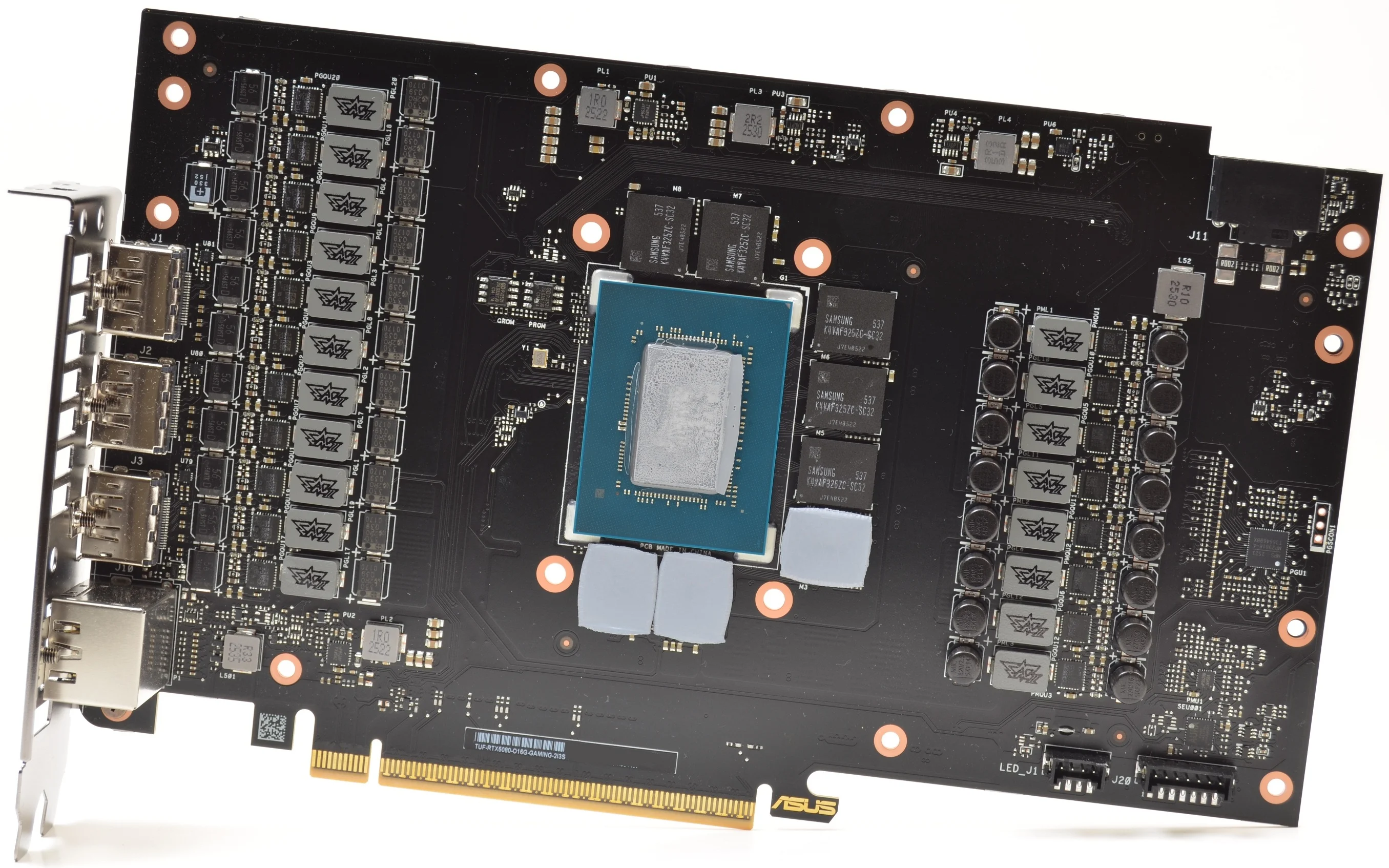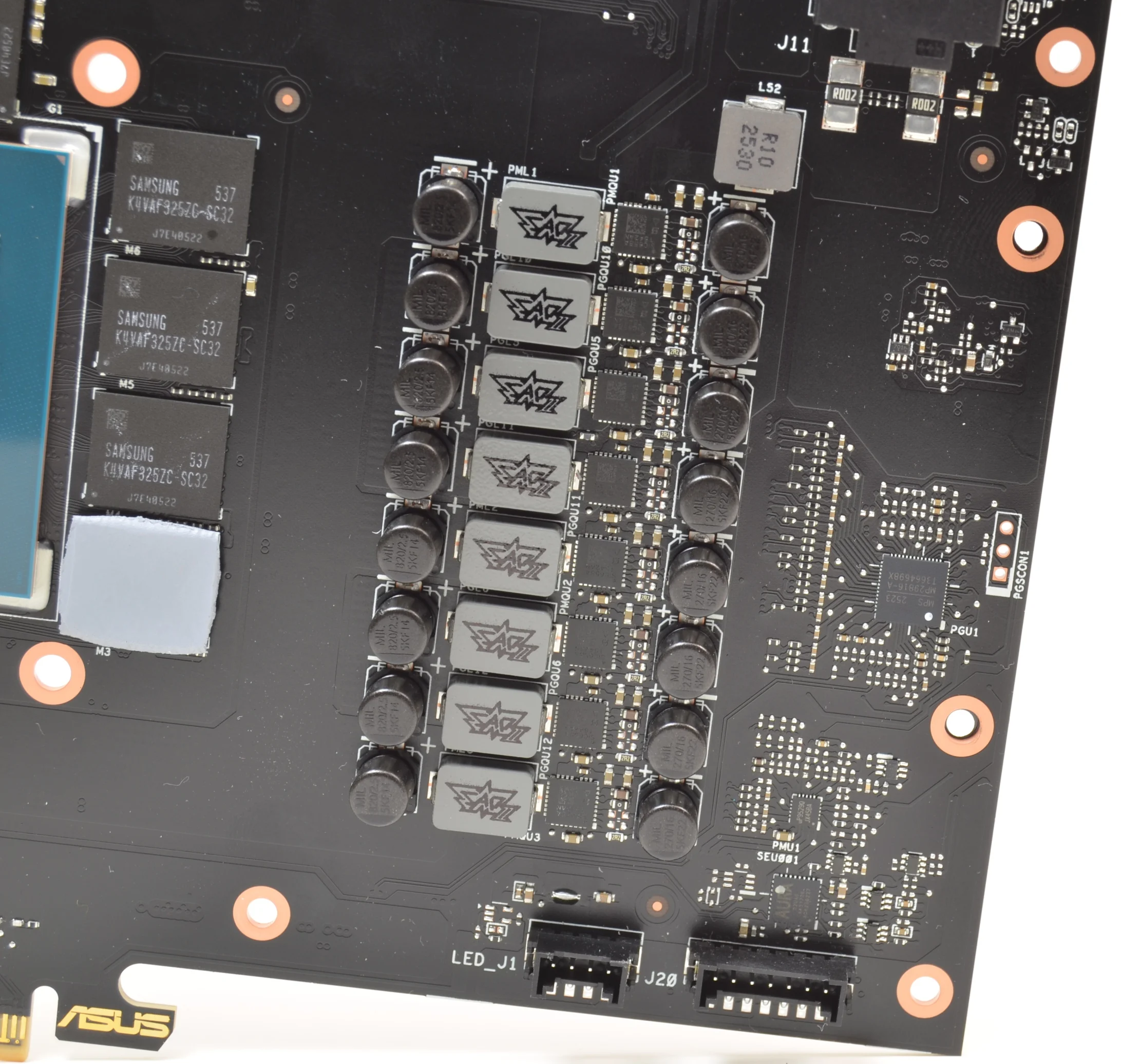 تستخدم ASUS عدد 19 مرحلة للبطاقة الرسومية و يتم تبريد المكثفات والخوانق (الأجزاء المستطيلة والمستديرة) في البطاقة الرسومية عن طريق المشتت الرئيسى من التبريد الكلي للبطاقة و سيتم تقسيمهم علي اليسار و اليمين و يوجد متحكمات خلف البطاقة :]