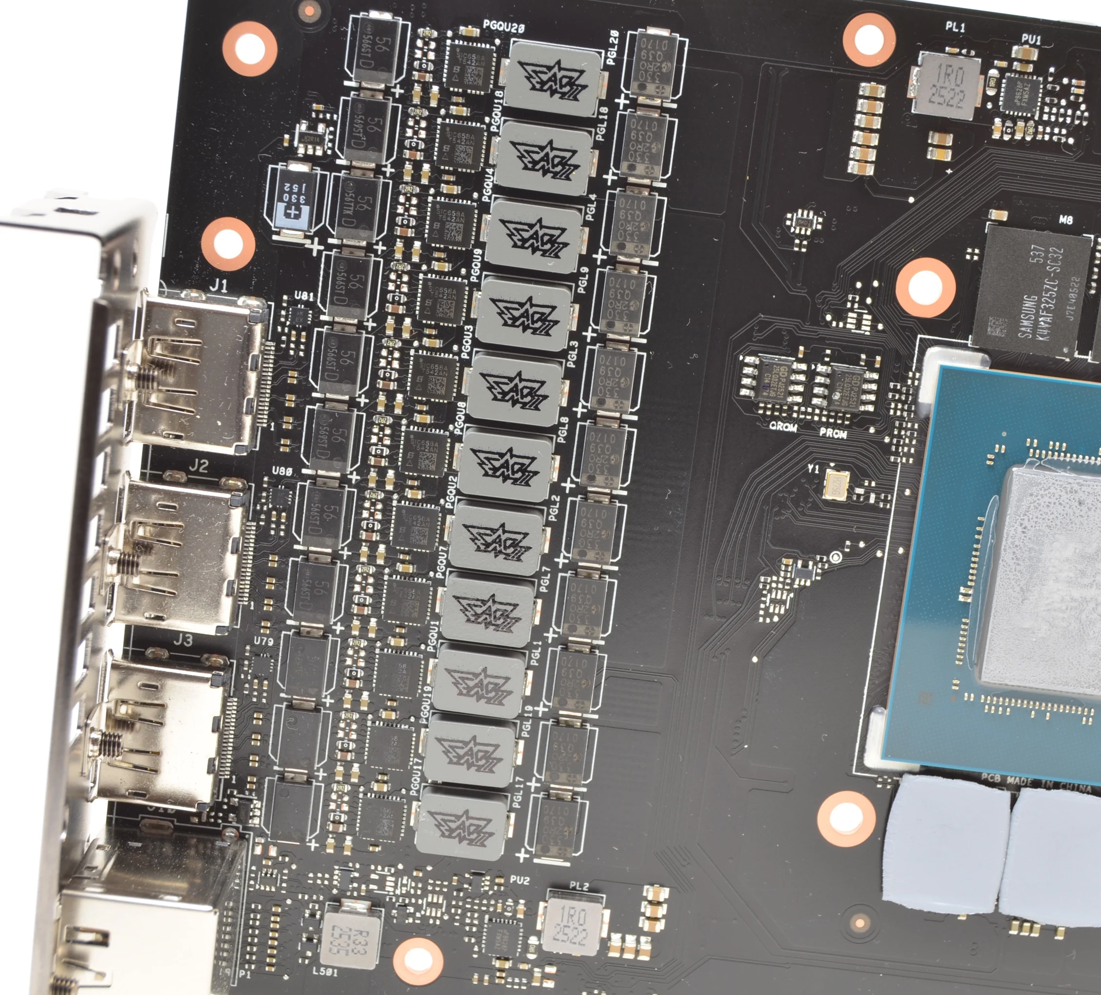 المتحكم : استخدمت الشركة متحكمين للطاقة ، اول متحكم وهو MP29816-A قادرعلى قيادة 12 مرحلة وهو يتحكم هنا في فولتية المعالج الرسومي 12 مرحلة و 4 مراحل للذواكر نفسها وهي الطريقة التي تتبعها Nvidia في تصميم دوائر الطاقة الخاصة بها و يتبقي متحكم أخر وهو uP9529Q يتحكم في 3 مراحل الخاصة بالتعامل بين الذواكر و المعالج الرسومي في البيانات وستجد هذا المتحكم في الأمام جهة اليمين
