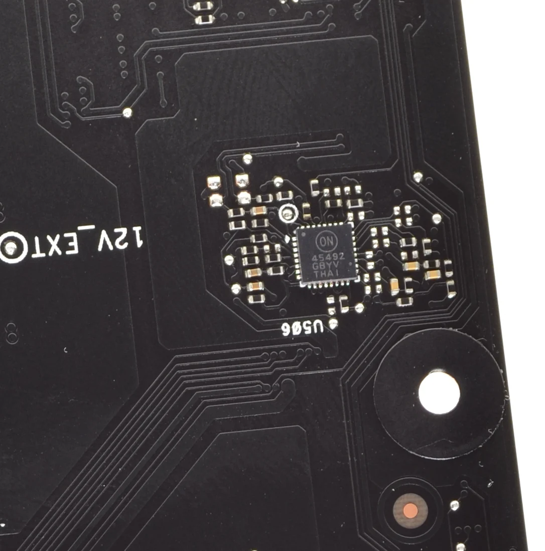 مرقابة الفولتية : يتم مراقبة الفولتية من خلال رقاقة onsemi NCP45494 و هي قادرة علي مراقبة الفولتية لعدد 4 مصادر هنا علي البطاقة