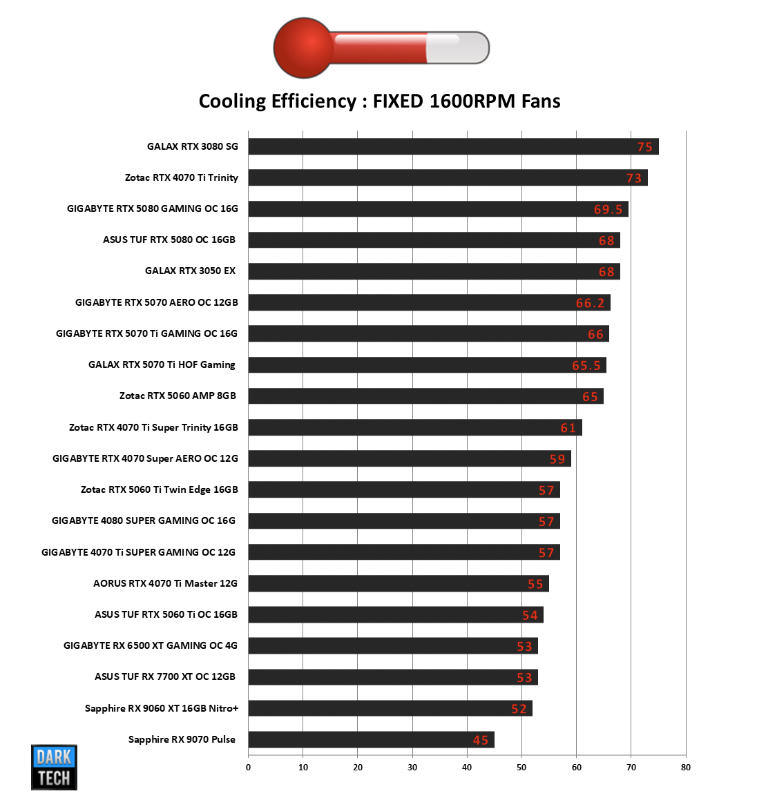 التبريد الخاص بالبطاقة جيد فحتي 65% من سرعة المراوح الصوت يكاد يكون مسموع وهو مؤشر ممتاز علي إمكانية الحصول علي معدل تبريد أعلي مع ضجيج اقل ، تبريد الصندوق الخاص بك يجب ان يكون جيد جدا لتحصل علي نفس درجات الحرارة الخاصة بنا في هذه المراجعة