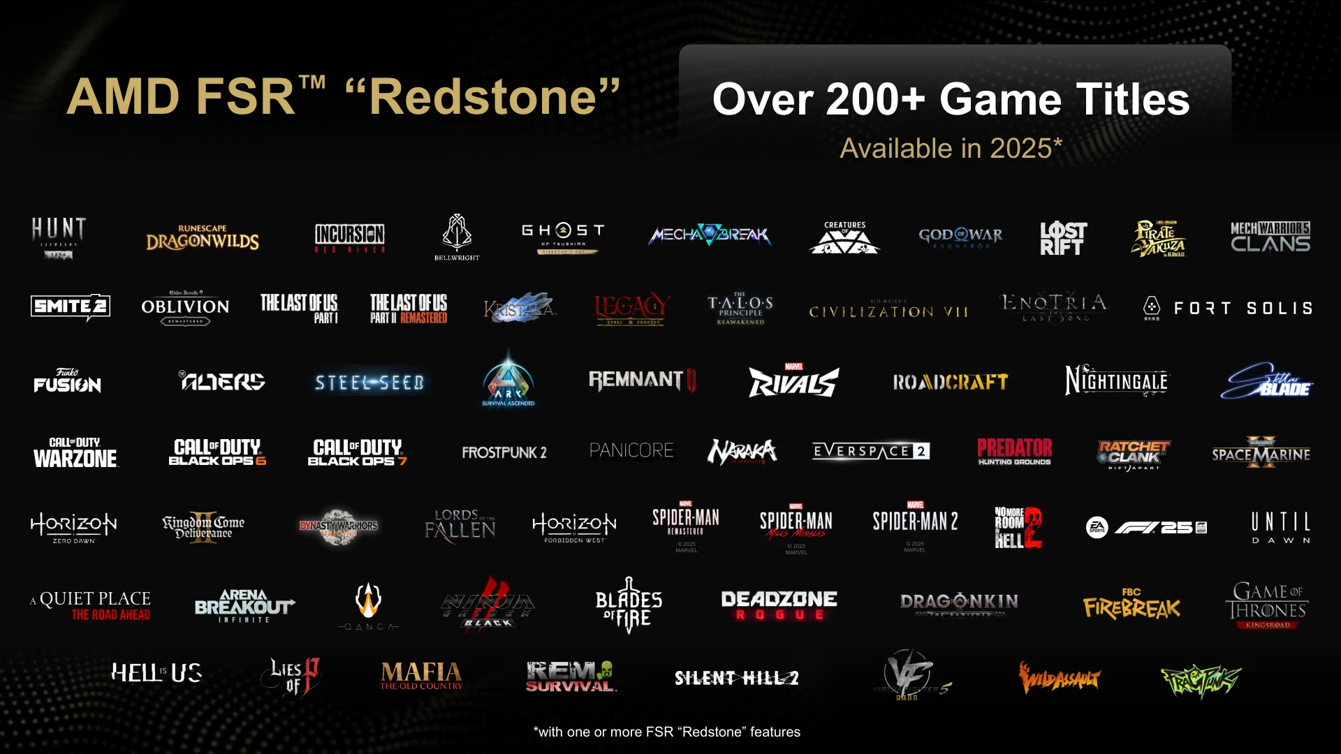 يوجد أكثر من 200 لعبة حاليا تدعم تقنيات FSR 4 بشكل عام و يتزايد العدد مع كل تحديث للألعاب و من الشركة عبر برنامج القيادة الخاصة بها وللقائمة الكاملة تجدها هنا : https://www.amd.com/en/products/graphics/technologies/fidelityfx/supported-games.html