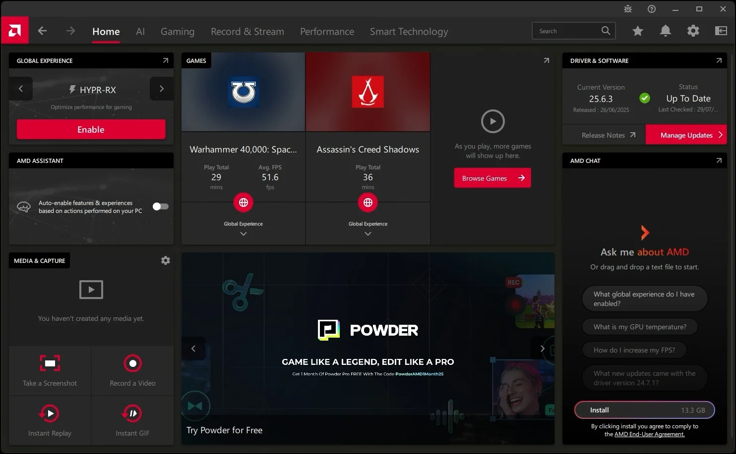 بداية يجب ان تملك أ؛دث تعريف من شركة AMD للبطاقات الرسومية RX 7000 حتي RX 9000 حيث تدعم بطاقات RX7000 تقنيات FSR 3.1 و بطاقات RX 9000 تدعم تقنيات FSR 3.1 و FSR 4 و REDSTONE حيث تملك البطاقات الجديدة وحدات كاملة لتنفيذ هذه التقنيات بدون خسارة أداء كبيرة و بشكل صحيح