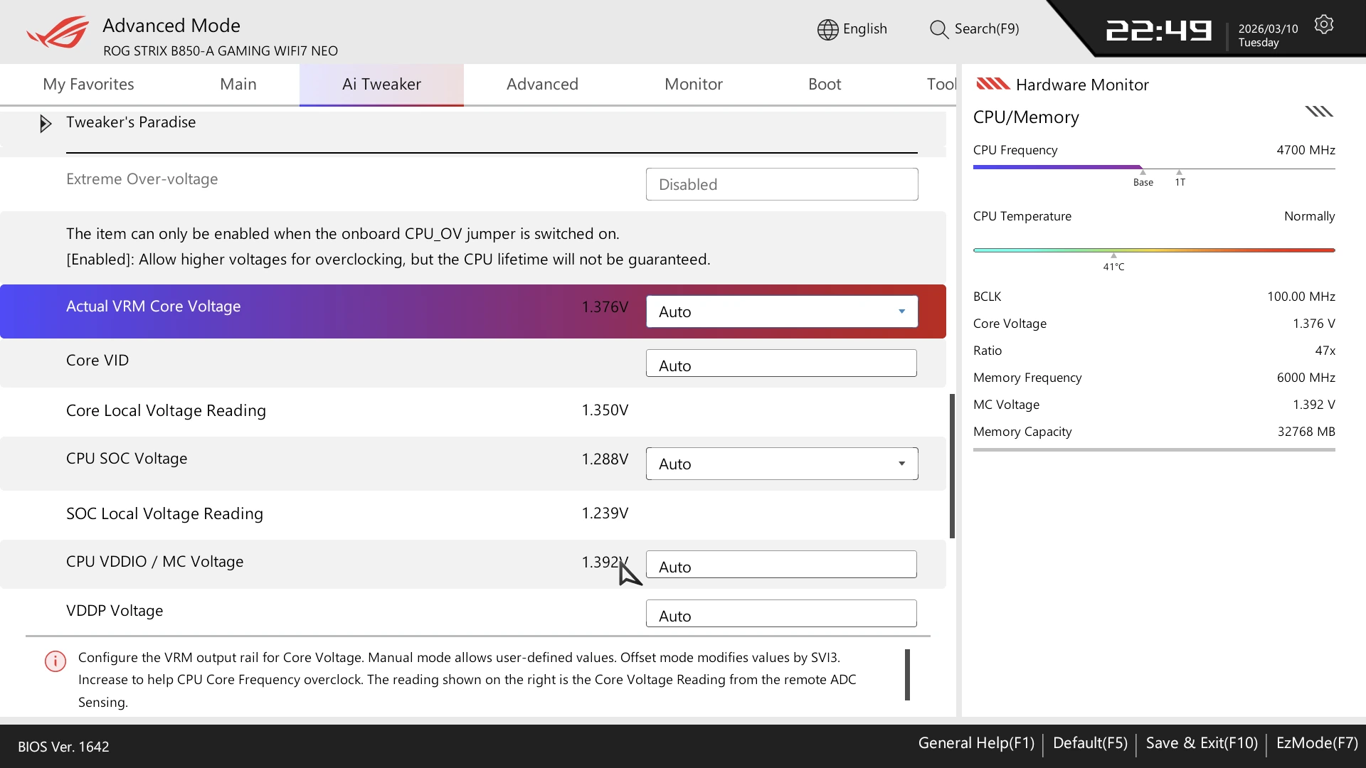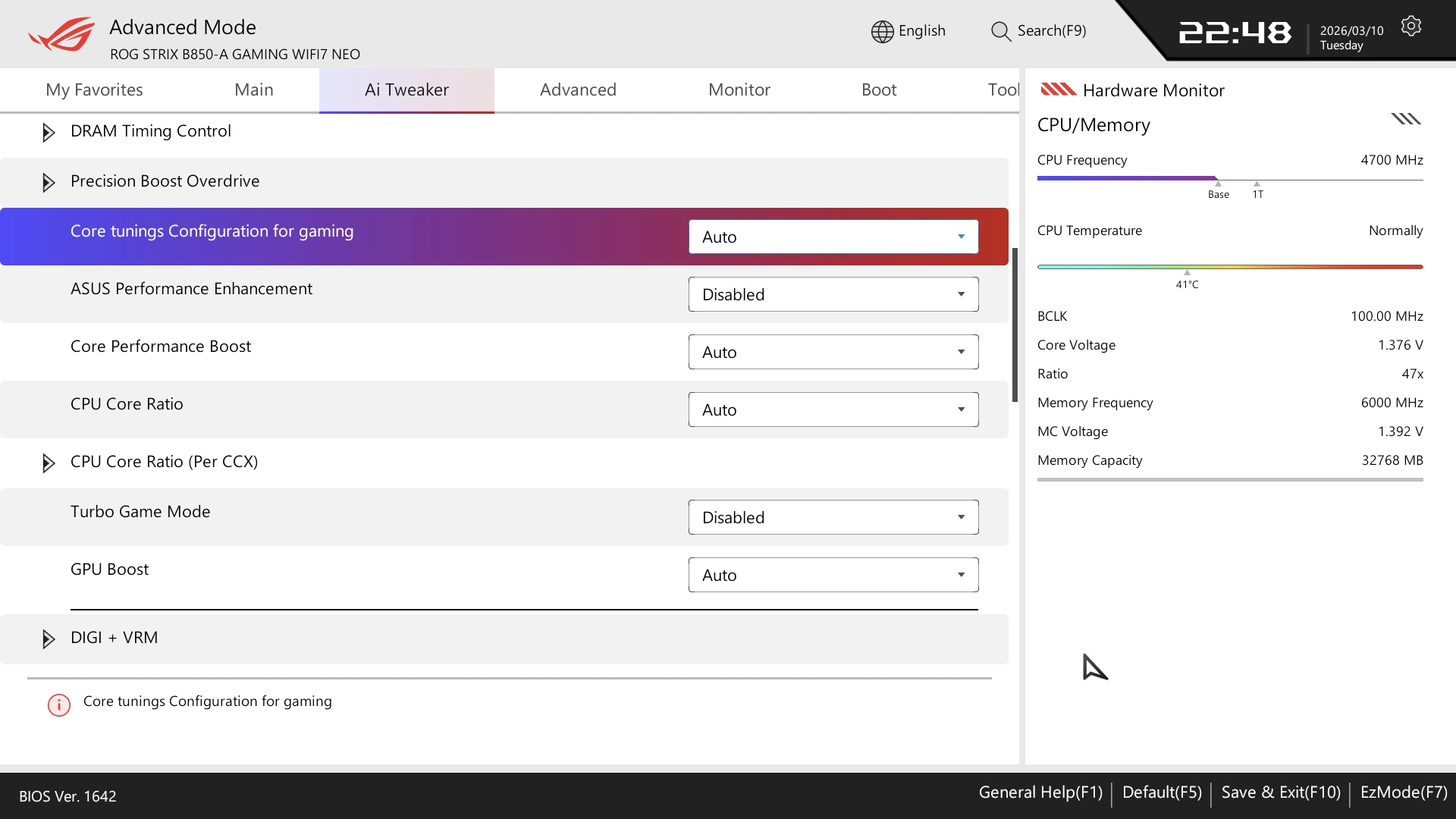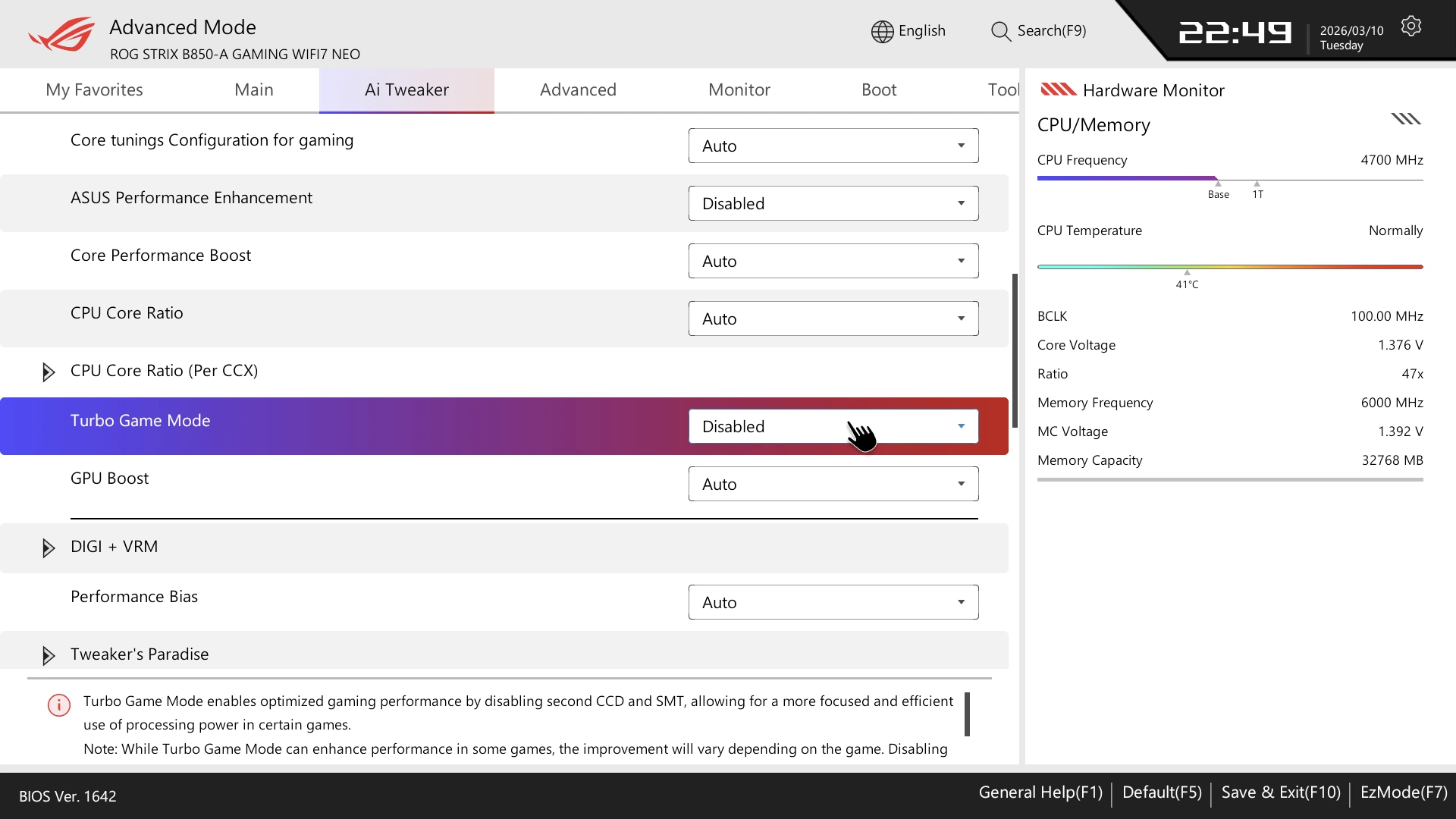 توفر ASUS الكثير من الخيارات لكسر السرعة للاعبين والمستخدمين التقليدين وحتي ميزة Ai Cache لمعالجات X3d لتسريع الأداء الخاص بهذه المعالجات فستجد الكثير من الخيارات هنا فمع إستخدام خيار gaming هنا ستجد أكثر من مستوي و تقوم هذه المستويات علي كسر سرعة المعالج الخاص بك لتحصل علي أداء أفضل بدون الكثير من الجهد وهو امر محمود بكل تأكيد للمستخدم .
