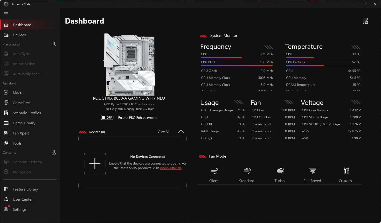 تأتي لوحات ASUS دائما مع حزمة برمجيات ممتازة و تطورت عبر السنوات لبرنامج Armoury Crate الذي يقدم للمستخدم التحكم الكامل في منتجات الشركة فهو اصبح بمثابة لوحة التحكم الرئيسية للمستخدم و الواجهة الأمامية الخاصة به تظهر في الصورة حيث تجميع بين كافة ما يمكن عرضة من تردد وحرارة وتحكم في الأداء وحتي تشغيل الألعاب وتغيير الإضاءة وغيرها من أمور لنتعرف عليه