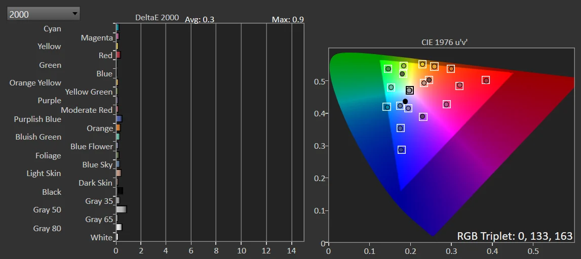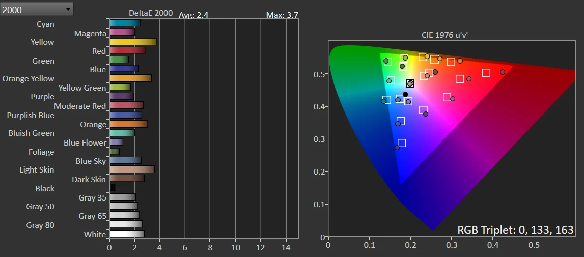 عند فتح الشاشة لأول مرة ستجد ان الصورة شبة مثالية وهو ما جعلني اشعر بالإندهاش فعادة الشاشات في هذه الفئة السعرية لا تملك معايرة قوية ولكن ما نراه اليوم شبه ممتاز حيث نتيجة درجة حرارة اللون هي 6443K وهو رقم ممتاز يقترب من المعايرة الإحترافية ، اما عن نتائج اللون الأبيض فهي 2.6 فهي ممتازة لكل المستخدمين و الألوان بمعدل اانحراف 3.4 وهي تقترب إلي ممتازة سواء للاعبين او المصممين ، معدل جاما ممتاز و معدل تباين ممتاز لشاشة IPS حيث تصل الشاشة إلي 1373 وهو ما يجعلها أعلي من المعلن من الشركة للمستخدم ، الشاشة تغطي 100% من sRGB و الشاشة مناسبة لصناعة المحتوي دون اي مشكلة ولكن لمحتوي sRGB.