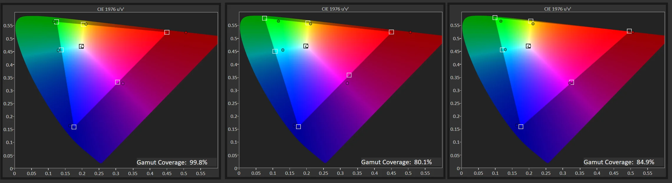 يتم قياس مدى تغطية الشاشة لمعاير الألوان المختلفة وهو ما سنراه في الجدول في الأسفل