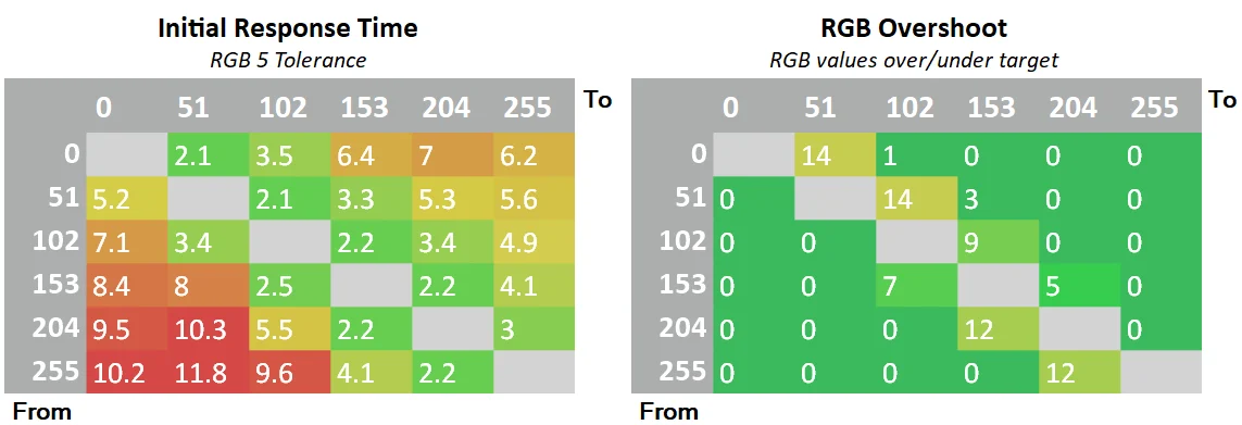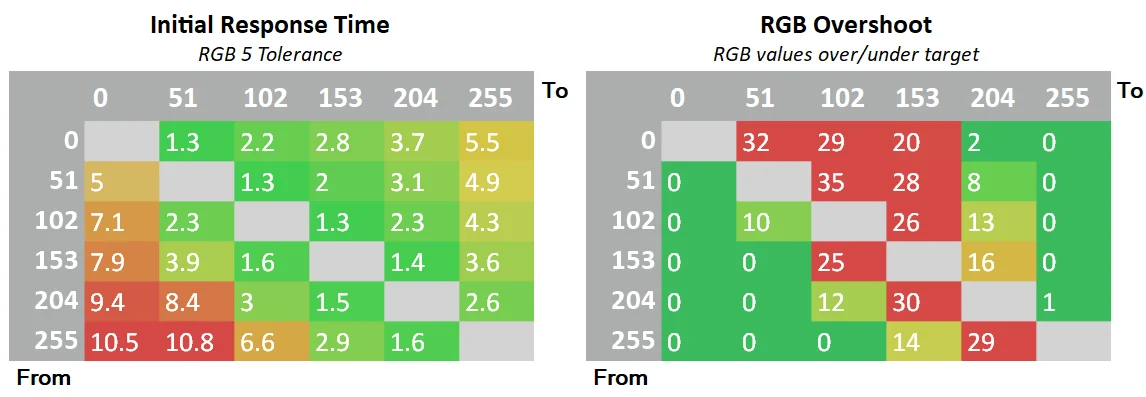 | Items | Avg GTG | Best Response | Average Perceived | Worst complete time | Input Lag | Avg RGB Overshoot error |
