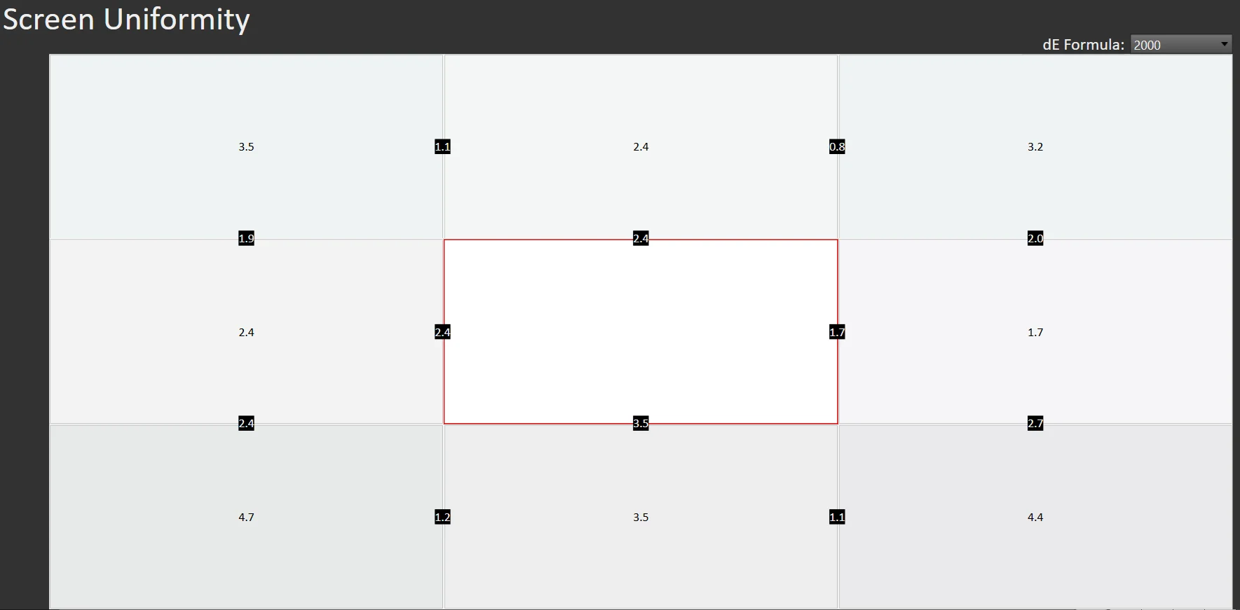 شبه لا يوجد اي تغيير في اللون الأبيض سوي في الأطراف حيث يقل السطوع نسبيا عن 350 شمعة حيث بلغت أقصي قيمة في تغيير اللون الأبيض هي 3.5 % فقط و أقل نسبة هي 1.5 و في المتوسط النسبة هي 2% فقط مما يعني أداء جيد جدا في جودة الصورة الكلية لإتساق اللون الأبيض التي يحصل عليها المستخدم و الألوان بعد ضبط الشاشة بكل تأكيد .