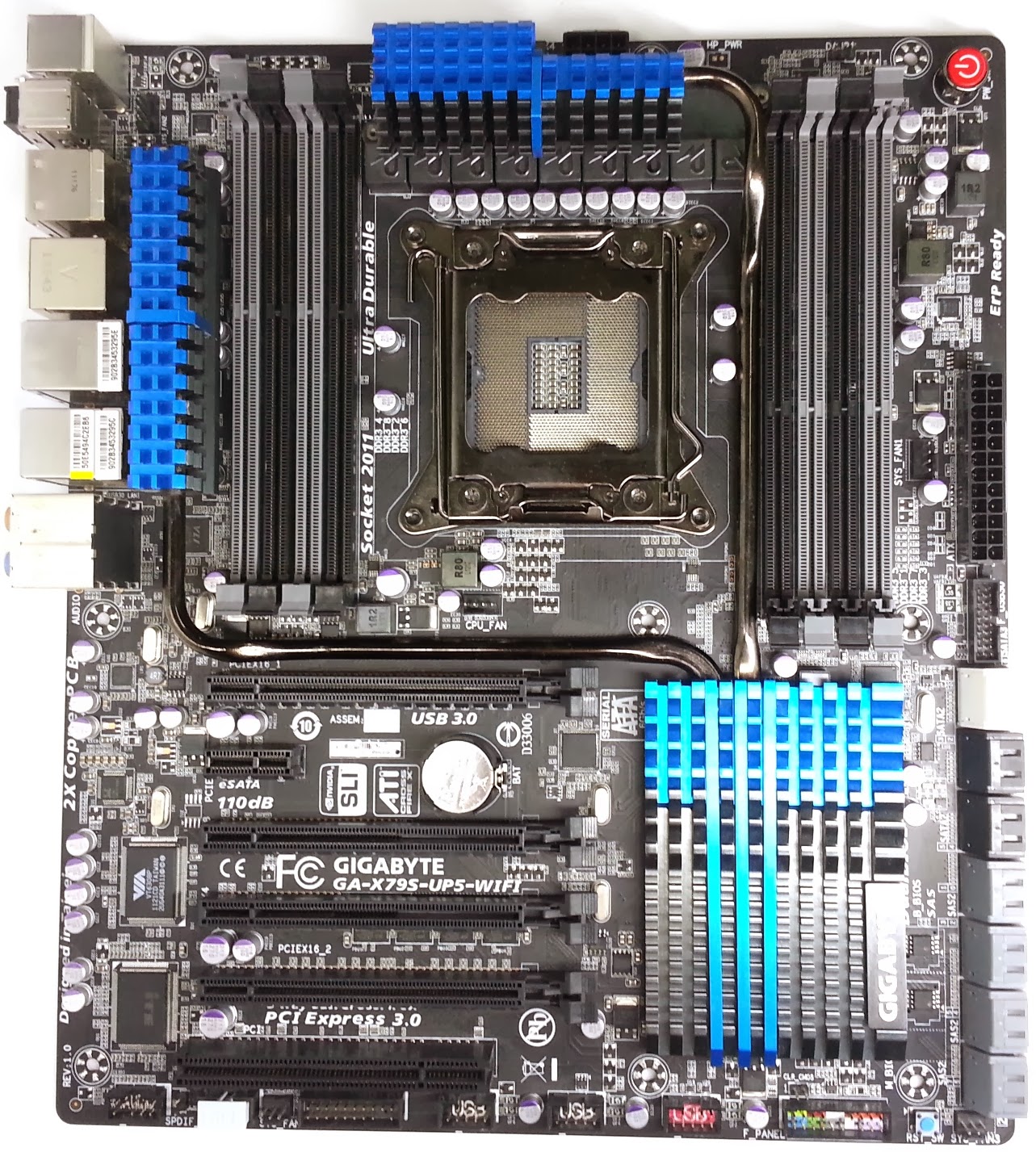 تتكون لوحة GIGABYTE X79S-UP5-Wifi من 8+1+1+2 مرحلة للطاقة المراحل الخاصه بالمعالج فقط هى ثمانية مراحل 8 خاصه بالمُعالج فقط ومرحله واحده بما يعرف بـSystem Agent ومرحلة واحدة لفولتية الـVTT ومرحلة لكل جه من الذواكر يُمكنك عد مراحل الطاقة من خلال الموسفت المُستخدم IR 3550 أو الخوانق (Chokes) لنرى المكونات المُستخدمه داخل دائرة الطاقة