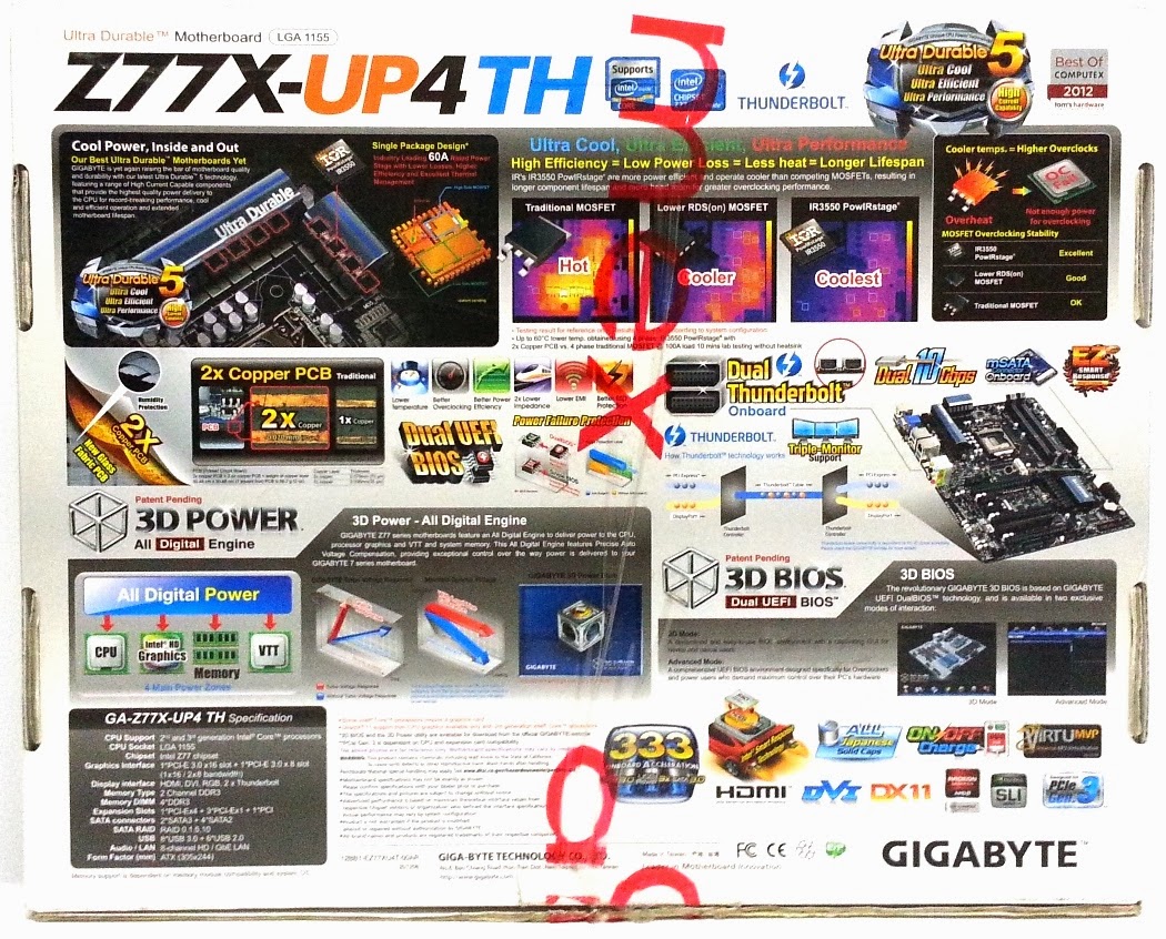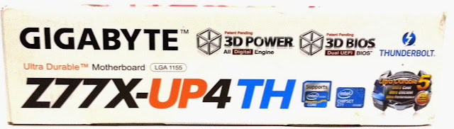 الوجهة الأمامية نرى موديل اللوحة ووجود حرف الـTH وهو أهم ما يميز لوحتنا سنتعرف عليه لاحقاً ونرى أيضاً بعض الشعارات الخاصه بشركة Intel وأيضا شعار معرض كمبيوتيكس 2012 حيث حصلت اللوحة علي أفضل جائزة Best Of COMPUTEX وأيضا شعار أفضل موسفت يُستخدم في اللوحات الأم من شركة IR