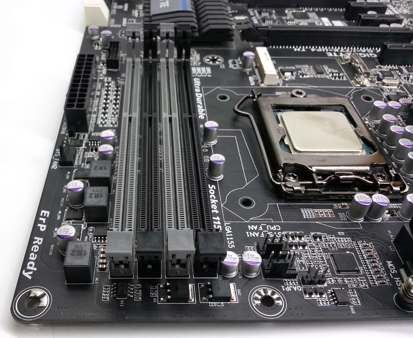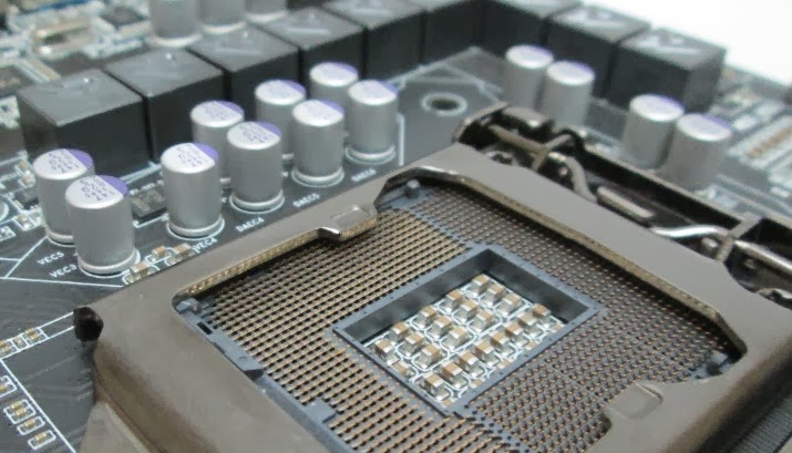 نرى هنا مقبس المُعالج وهو بالطبع مقبس 1155 الداعم لمُعالجات Intel Core I7/5/3 من الجيل الثالث نعم فقط 5 سنون تم حزفهم من المقبس من قبل شركة intel لتقدم مُعالجات الجيل الرابع 😀