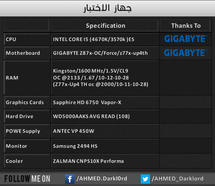 يتم تشغيل برامج الأختبار 3 مرات مُتتالية للحصول علي نتيجة ثابته وتقليل مُعامل الخطأ ويتم أعتماد النتيجة المتوسطة للثلاث مرات أو أعتماد النتيجة أذا لم تتجاوز هامش الـ1% (50-50.1-50) كمُعامل خطأ بالطبع بيئة الأختبار يتم أغلاق كافة البرامج ونسخةSP1 Windows 7 نظيفة كما يوجد جدول في الأسفل به جهاز الأختبار والبرامج المُستخدمة ملحوظة البطاقة الرسومية أعلم أنها ليست قوية ولكن نحن بصدد مُراجعه للوحة أم وليس لبطاقات رسومية فهي غير مؤثرة حيث أن الغرض منها هو قياس حساسية الشقوق الرسومية في اللوحة الأم لذلك لا تعيرها أي أنتباه