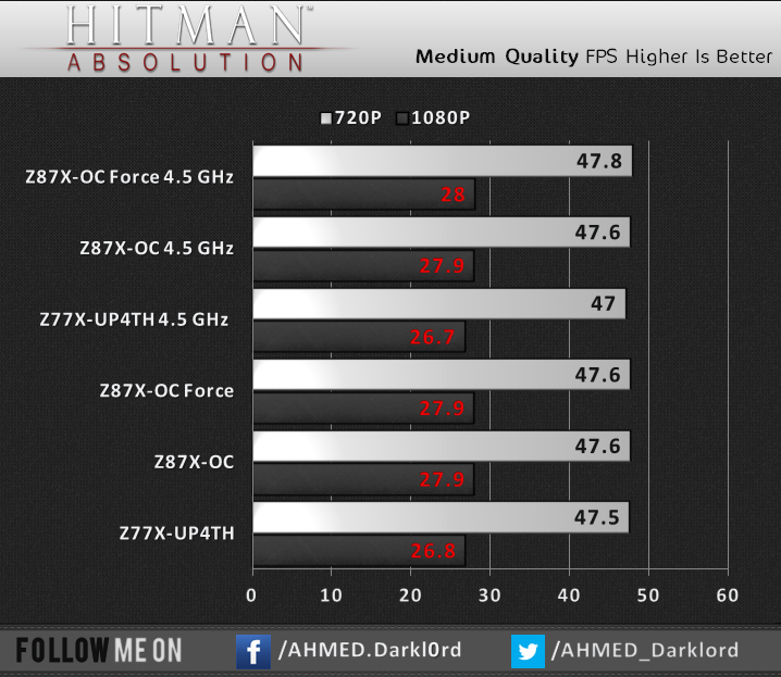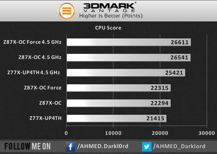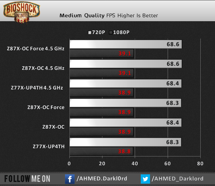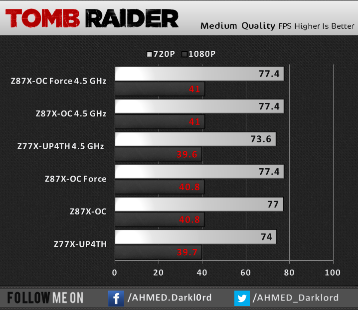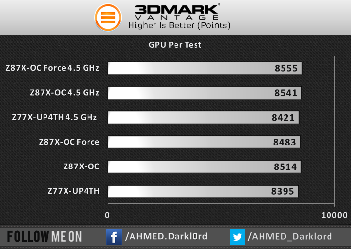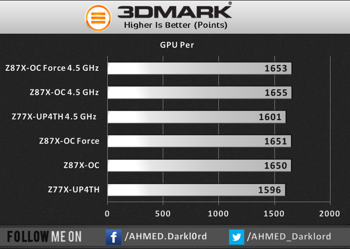 هنا أعلم ان المعالج الرسومى ضعيف ليوضع مع مُعالج 4670K ولكن الهدف هنا ليس أختبار بطاقة رسومية إنما هو أختبار تعامل اللوحة مع شقوق البطاقات الرسومية حيث أن اي اختلاف في النتائج سيظهر هنا سيكون بسبب الشقوق الرسومية الخاصه باللوحات لأن البطاقة ستكون ثابته المُعالج مركزي أيضا ً