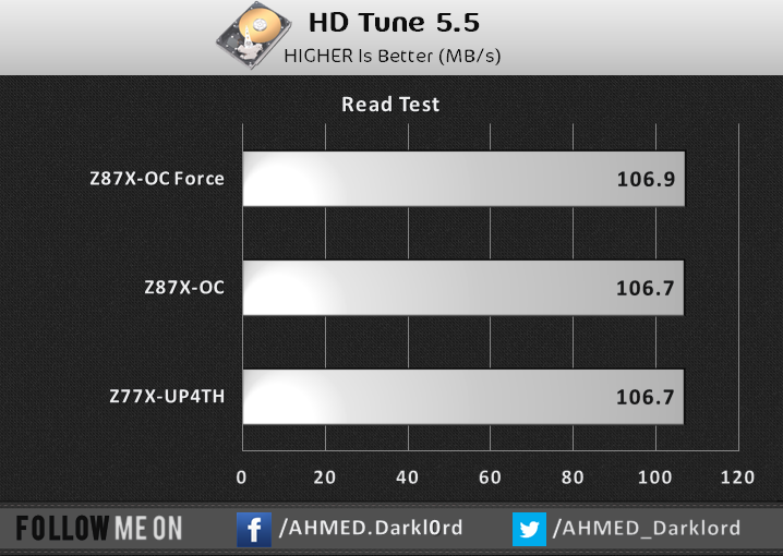 HD TUNE هنا يجب أن ترى كيف تتعامل اللوحة مع أقراص التخزين HDD من المُفترض ان يتم هذا الأختبار مع أقراص صلبة SSD لتوضح الفرق بصورة أكبر لذلك قم بأضافة هذا الأختبار كنوع من التجربه ولكن لا أتوقع أن أرى أي فرق في الأدء ربما مُستقبلاً قد نرى فرق