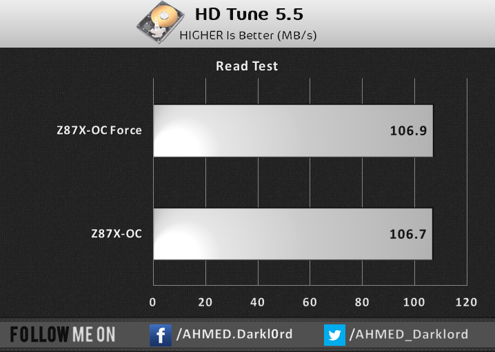 HD TUNE هنا يجب أن ترى كيف تتعامل اللوحة مع أقراص التخزين HDD من المُفترض ان يتم هذا الأختبار مع أقراص صلبة SSD لتوضح الفرق بصورة أكبر لذلك قم بأضافة هذا الأختبار كنوع من التجربه ولكن لا أتوقع أن أرى أي فرق في الأدء ربما مُستقبلاً قد نرى فرق