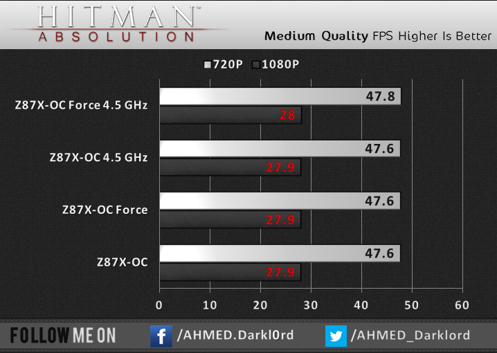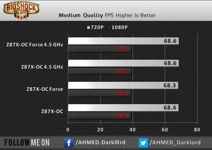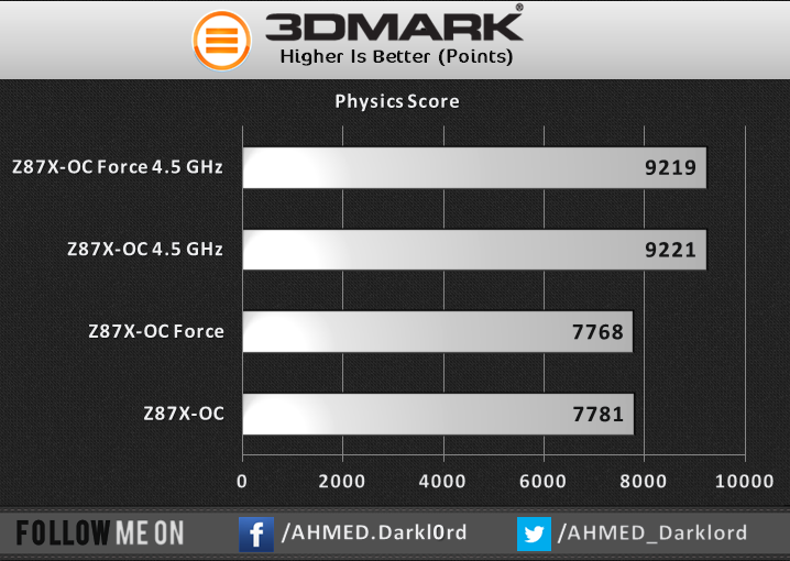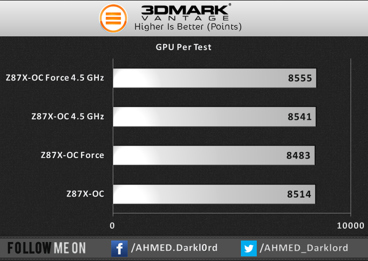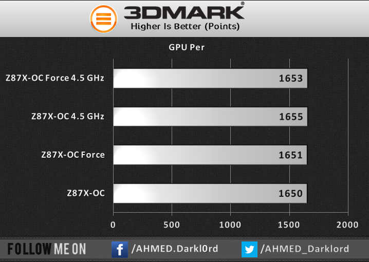 هنا أعلم ان المعالج الرسومى ضعيف ليوضع مع مُعالج 4670K ولكن الهدف هنا ليس أختبار بطاقة رسومية إنما هو أختبار تعامل اللوحة مع شقوق البطاقات الرسومية حيث أن اي اختلاف في النتائج سيظهر هنا سيكون بسبب الشقوق الرسومية الخاصه باللوحات لأن البطاقة ستكون ثابته المُعالج مركزي أيضا ً