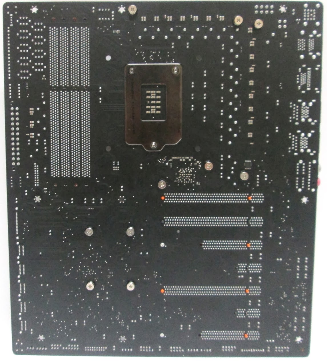 ظهر اللوحة وتتكون لوحة الدوائر المطبوعه من 8 طبقات وبالتالي هي تملك  طبقات أضافية عن أختها الصغرى Z87X-OC كل هذا يأتي من أجل كسر سرعه أفضل بدون شك فاللوحة صلبة وثقيله بطريقة غريبه أظن هذا سيساعد أصحاب المُشتات العملاقة مع اللوحة