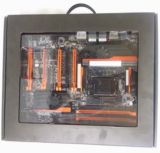 هنا تأتى لوحتنا باللون الأسود والبُرتقالى مع تغيير في تصميم المُشتتات حيث تأتي تلك اللوحة مُختلفه في التبريد عن أختها الصغيرة Z87x-OC  بحيث تتيح تلك اللوحة التبريد الهوائي والمائي معاً لكافة أجزاء اللوحة و يُمكنك مُلاحظة المنفذ ذو اللون الأحمر وهو المنفذ الخاص بالـUSB 3.0 وتقنية الشحن السريع كل ما تراه هنا سيتم شرحة باستفاضة في الأجزاء القادمة